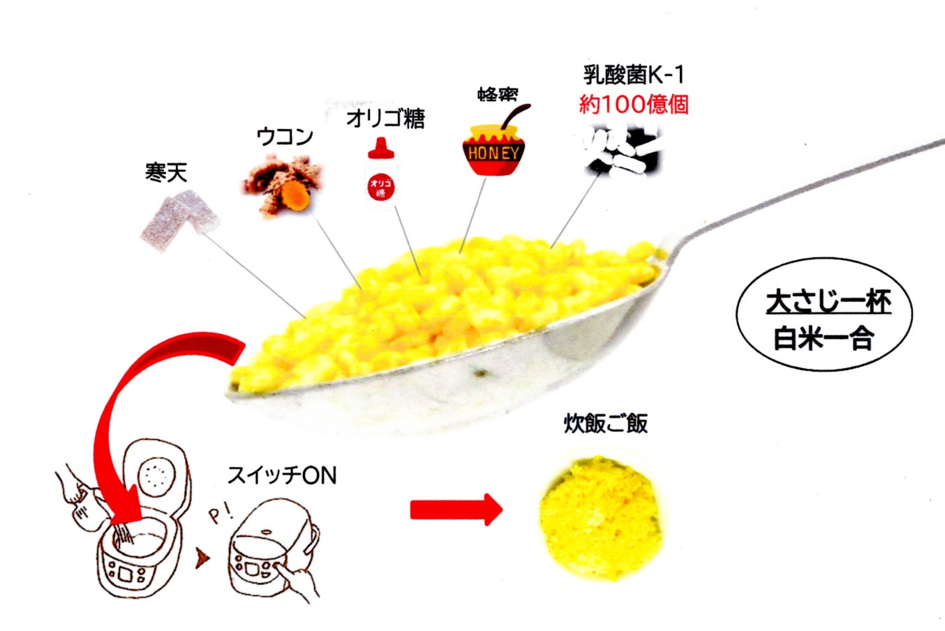 植物性乳酸菌K-1は賦活能力の高い死菌で炊飯しても効能は変わらず、大さじ一杯に約100億個含有