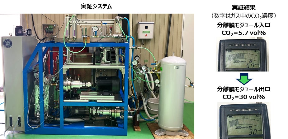 当社は、廃熱エンジン駆動型のオフグリッドORC発電システムや冷蔵システムの開発と事業化を推進している株式会社馬渕工業所(本社:宮城県仙台市、代表取締役 小野 寿光)とCO2分離膜メーカー協力のもと、75℃という低温の温水でも稼働できる「未利用熱エンジン駆動型CO2分離回収システム」を開発し、1段の分離膜モジュールを組み合わせるだけで、約6%のCO2を含むガスから、約5倍となる30%のCO2を含むガスを濃縮回収できること(2段以上の多段化で95%超の高濃度回収も可能となる見通し)を実証しました。