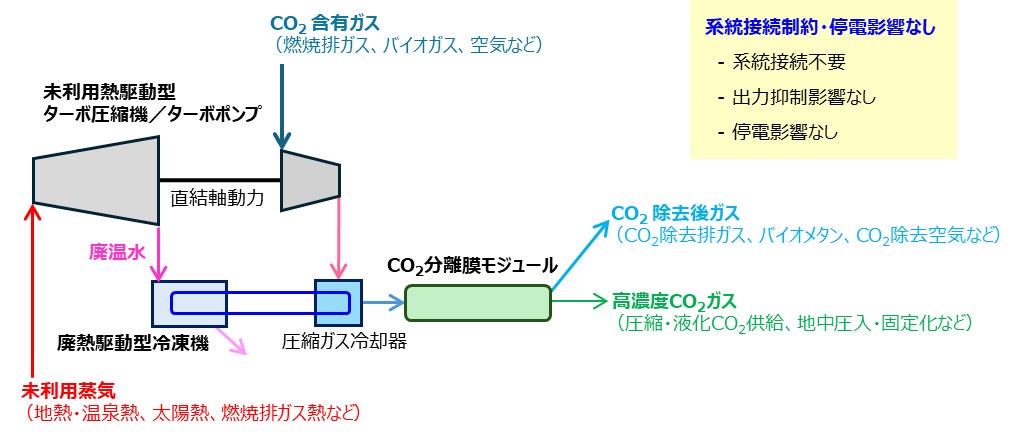 本技術は、地熱・温泉熱や太陽熱、バイオマス燃焼時の排気ガスがもつ再生可能エネルギー熱のほか、化石燃料燃焼時の排気ガスがもつ熱エネルギーで稼働する廃熱エンジン駆動型のガス圧縮機と、簡素で低コストなCO2分離回収技術として注目されるCO2分離膜モジュールを組み合わせることで、CO2を分離回収する工程で発生するCO2の発生量を最少化したゼロエミッション型の分離回収を実現できる、当社独自の特許技術です。