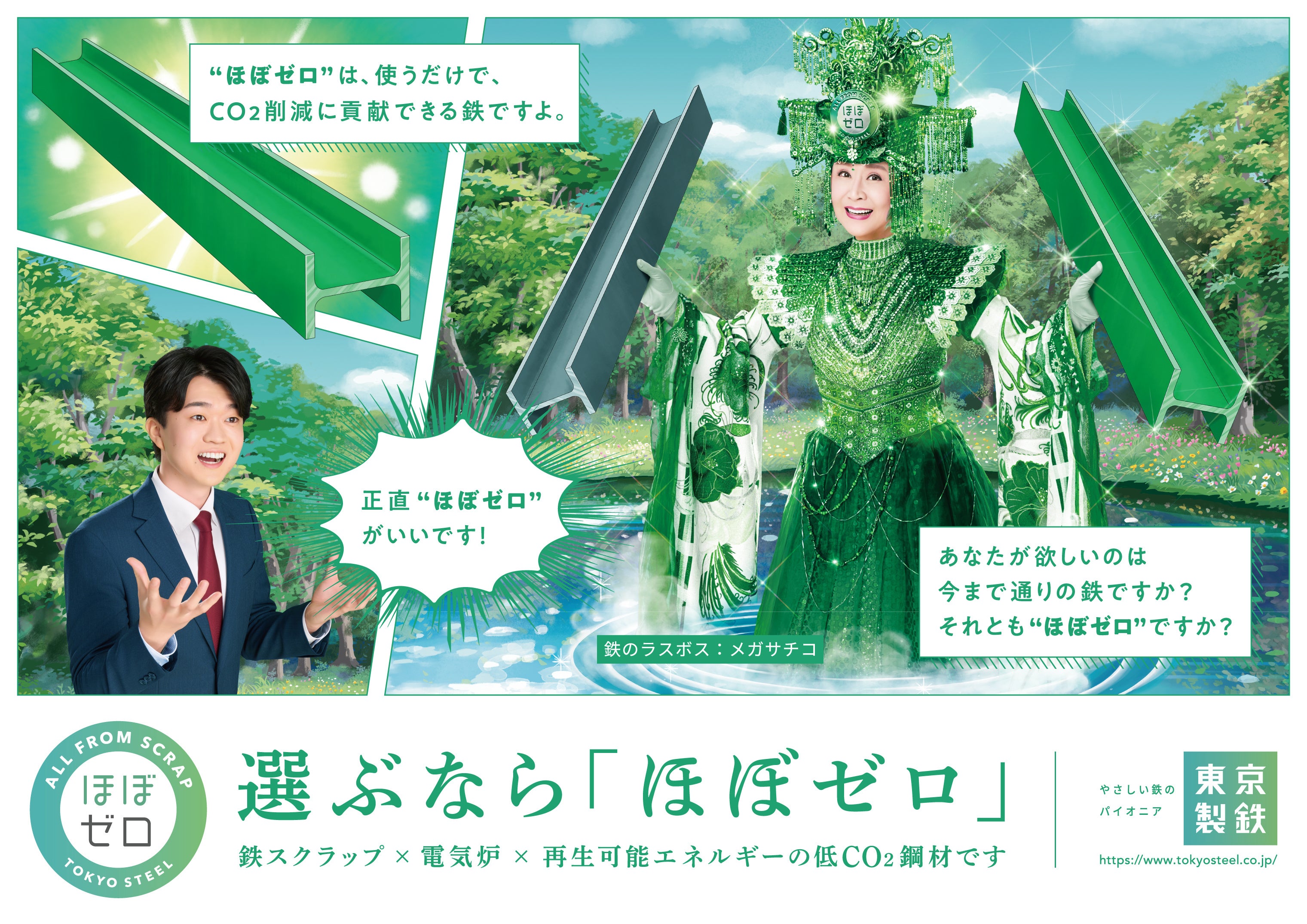 東京製鐵が促進している低CO₂鋼材「ほぼゼロ」は、脱炭素社会への切り札となる“鉄のラスボス”であることから、豪華な衣装から“ラスボス”と呼ばれることも多い小林幸子さんを広告に起用しています。東京製鐵の広告起用2年目となる今回は、実写の小林幸子さんと漫画の世界観が融合したユニークなクリエイティブを作成しました。