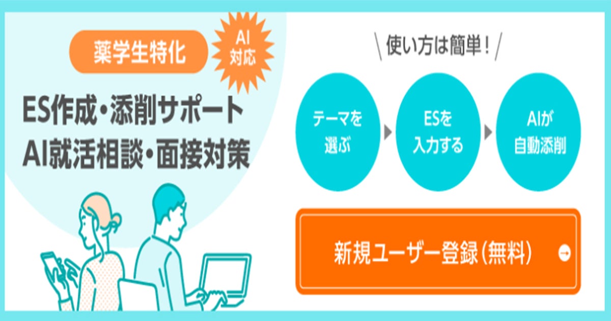 薬学生向けに最適化したAIが、ES作成や就活の悩みに24時間対応します(※当社調べ:業界初)。