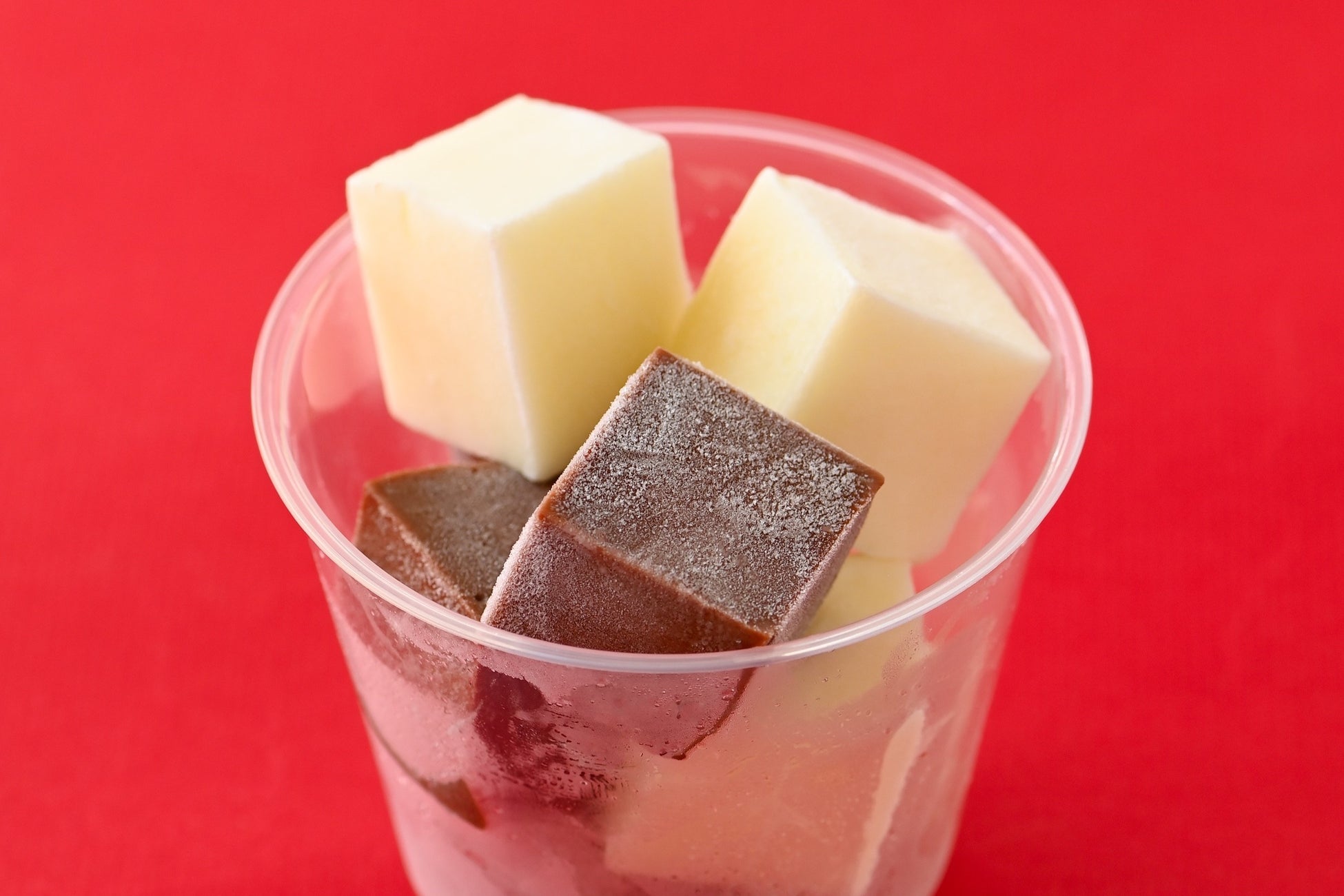 アイスバーのようにそのままかじることができる、棒タイプの「バー」と、一口サイズにカットしたカップ入りの「キューブ」。