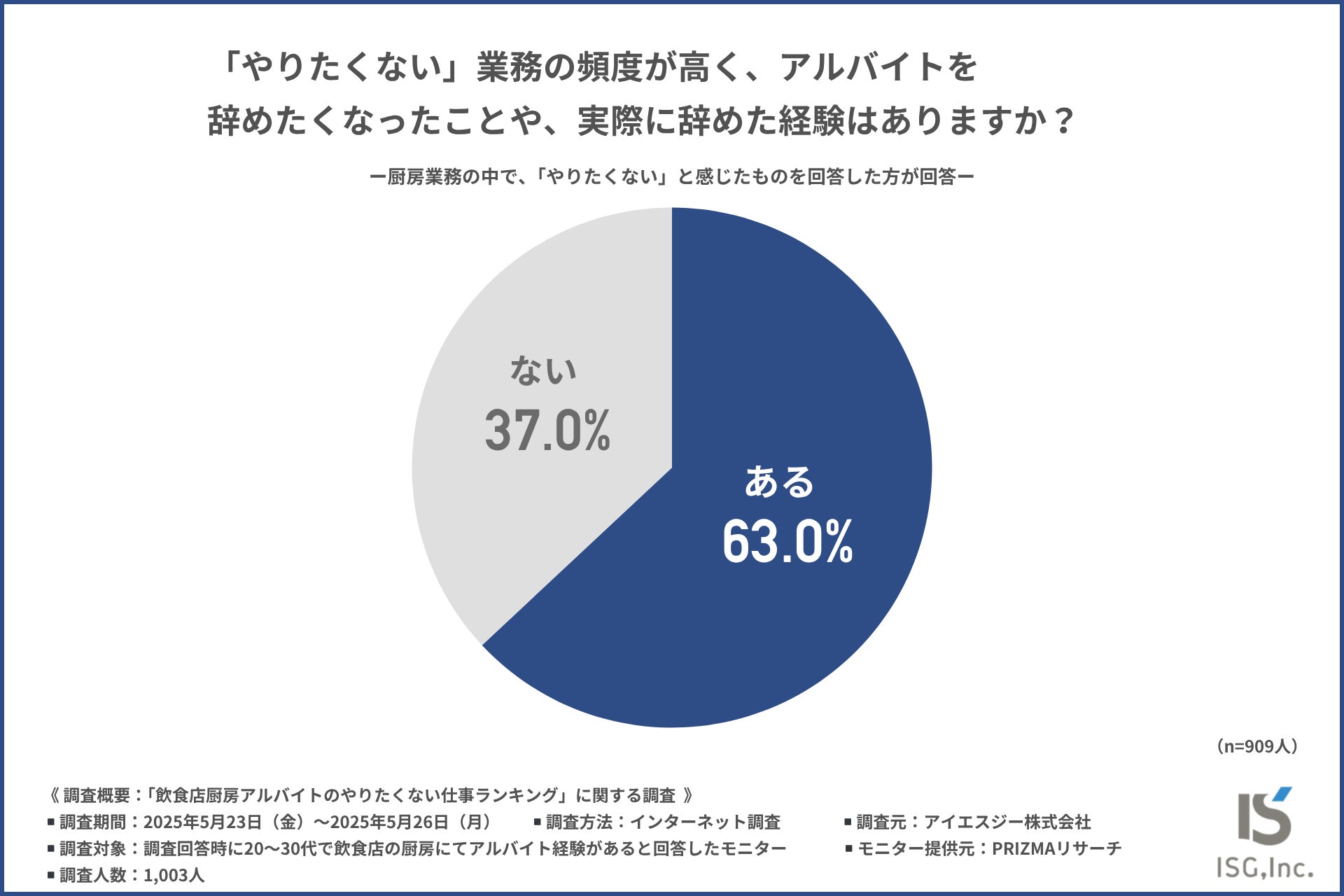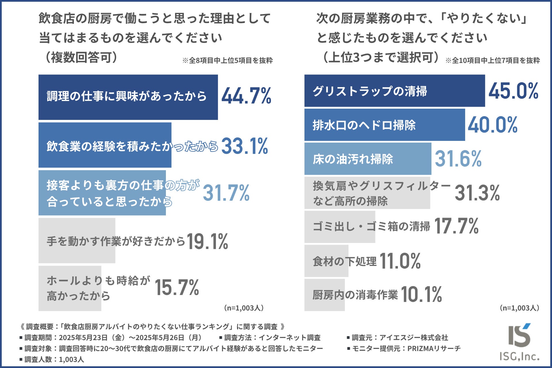 そこで今回、アイエスジー株式会社(https://www.isgnet.jp/)は、20~30代で飲食店の厨房にてアルバイト経験がある方を対象に、「飲食店厨房アルバイトのやりたくない仕事ランキング」に関する調査を行いました。
