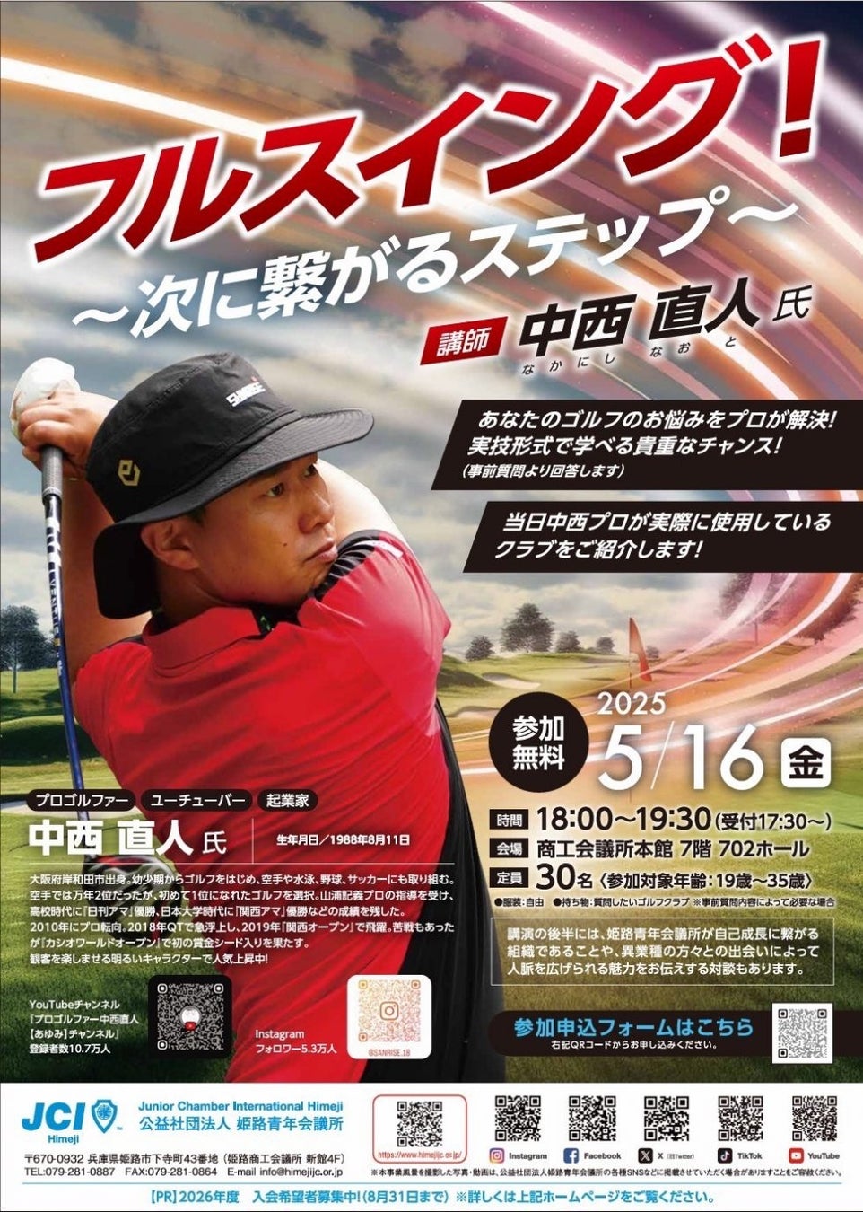 当日は参加者から事前に募集した質問に中西プロが実技形式で解答していただけます。ゴルフの悩みがある人はプロから学べる貴重な機会であり、講演の後半には姫路青年会議所の魅力を伝える対談もあります。