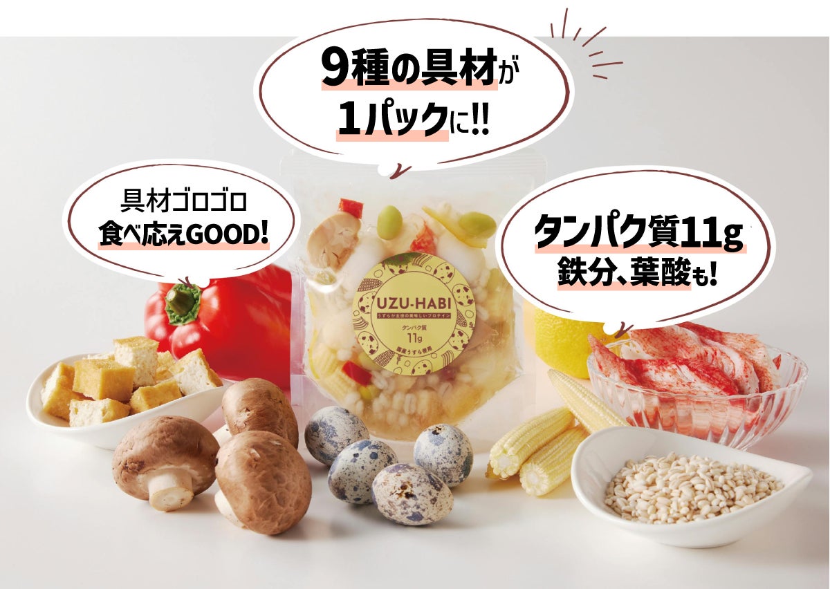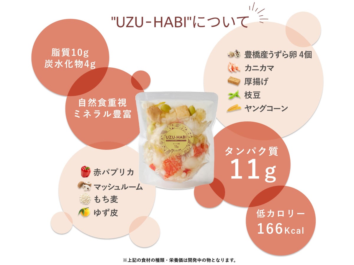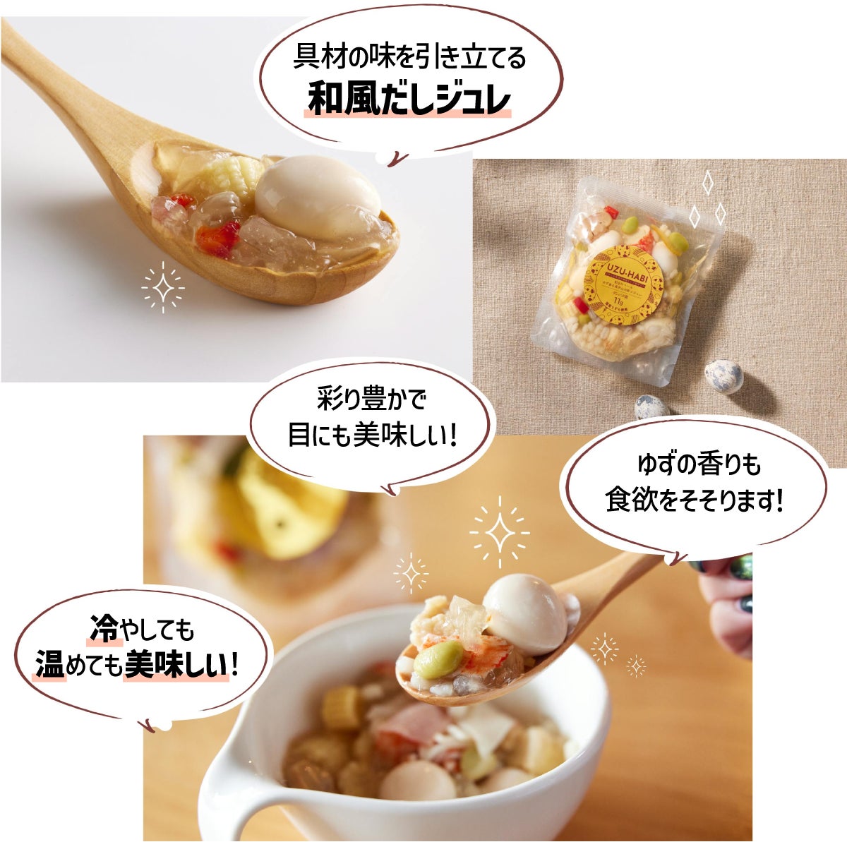 うずら卵単体を多く食べてもらう事を目指すのではなく、食事として機能を果たす事を重要視しています。うずら卵が主役としながら、バランス良く1パッケージで完結するものを目指しています。食材は豊橋うずら卵をはじめ、9種類を「和風出汁ジュレ」に閉じ込めタンパク質11g、鉄分、葉酸などミネラルも摂取可能にしています。内容量は160g。具材たっぷりで食べ応えもGOOD!です。