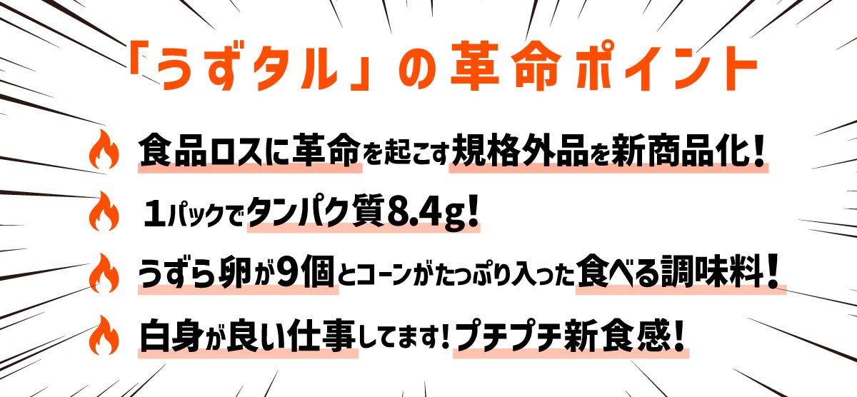 うずら卵の水煮を作るとき、どうしても規格外品が発生してしまいます。例えば、100個入りのレトルトのうち1個でも割れると液が濁ってしまい、残りの99個まで商品価値が下がってしまうんです。そんな「もったいない!」を「美味しい!」に変えられないか? そこで生まれたのが「うずタル」です。