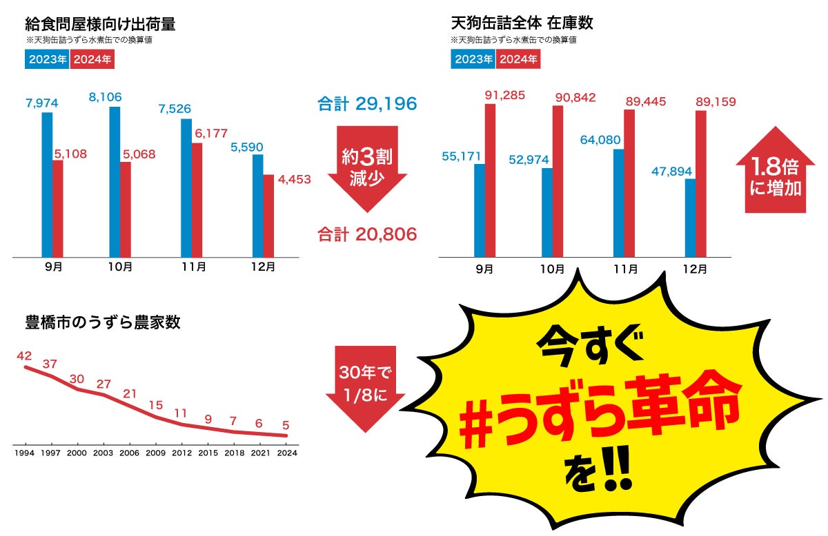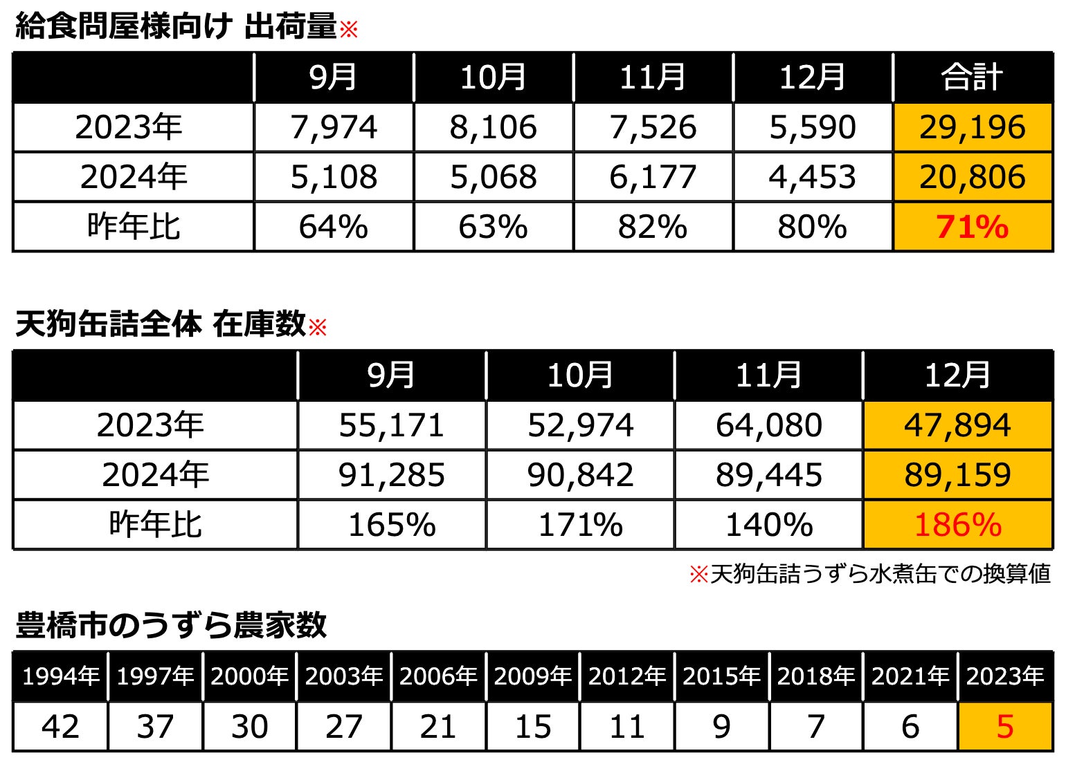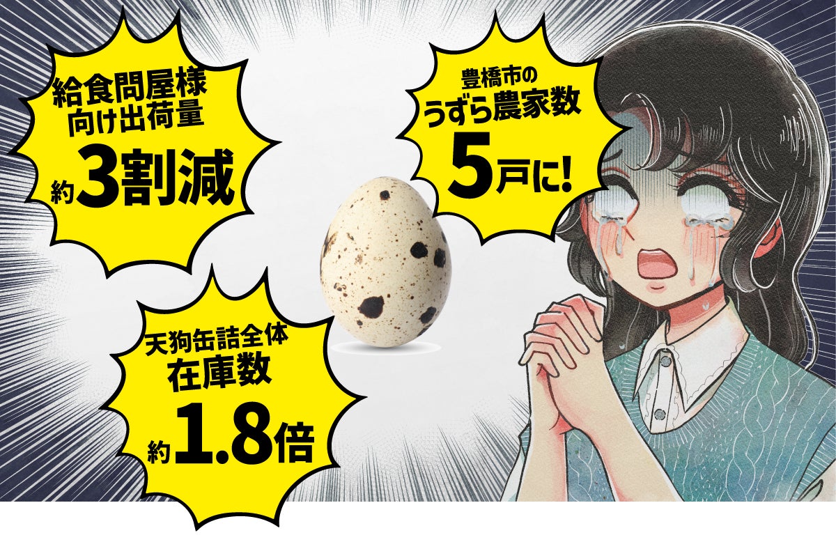 国産うずら卵は2024年2月の福岡県で発生した学校給食での誤嚥事故以降、販売環境が激変し、主要需要先の全国の学校給食おいて使用中止や使用抑制され、需要が壊滅的な状況にあります。しかしうずら卵生産農家の経営の安定を考え、天狗缶詰は減産策は行わず、製品在庫が増加し続ける厳しい状況にあります。