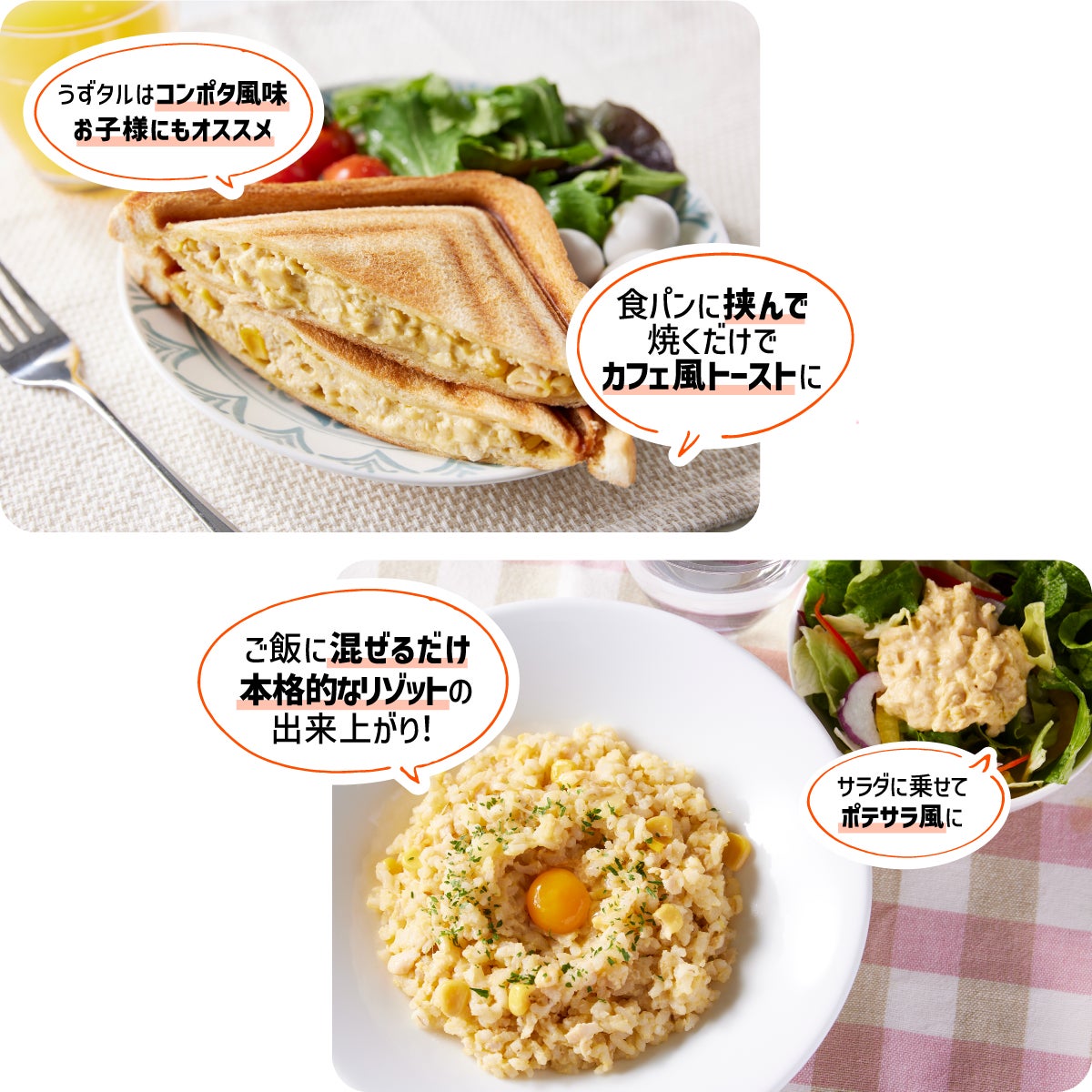 鶏卵よりも黄身の割合が多いうずら卵ならではの濃厚さを活かし、コーンポタージュをイメージしたクリーミーな味わいに仕上げました。コーンの粒感がアクセントで、食感も楽しい!