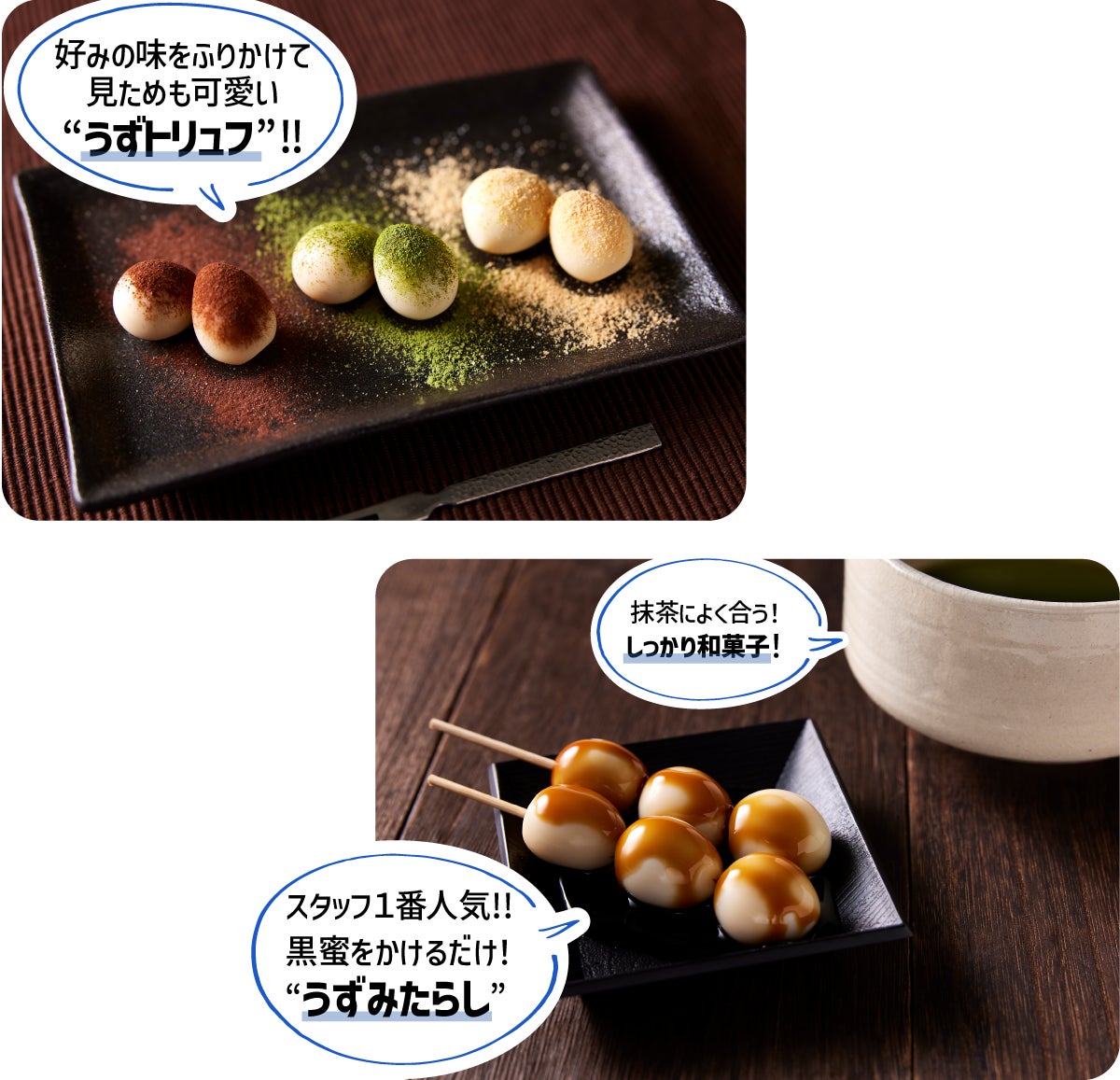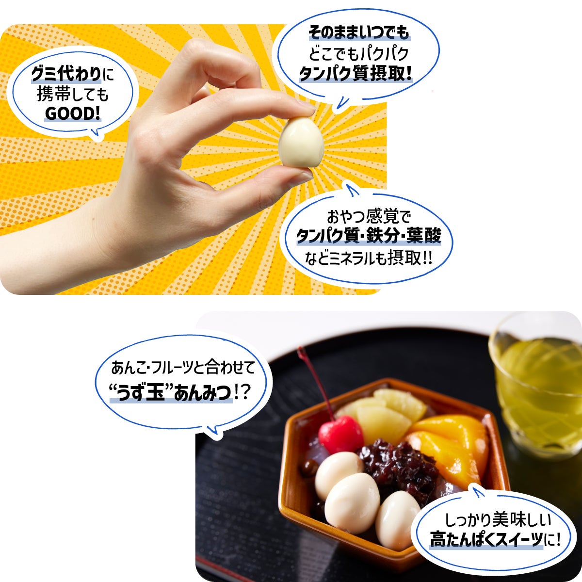「みるくうずら」は、ほんのり甘いミルク風味で、スイーツ感覚、おやつ感覚で楽しめます。ツルンとした食感のうずら卵を噛むと、中からプリンやカスタードクリームを思わせる優しい甘さの黄身があふれます。液なしだから取り出しやすく、一口サイズでそのまま楽しめます。あんみつやフルーツポンチの白玉団子のようなトッピングにもぴったりで、和スイーツにもマッチ!