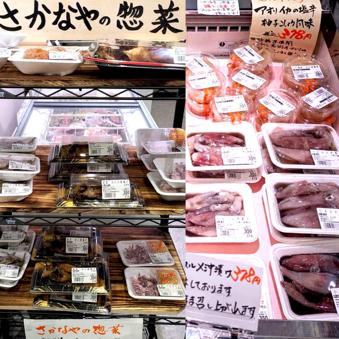 新鮮な魚介類を使用した惣菜も好評です。手作りの柚子胡椒風味の塩辛や一夜漬けなど他店にはないラインナップも取り揃えております。