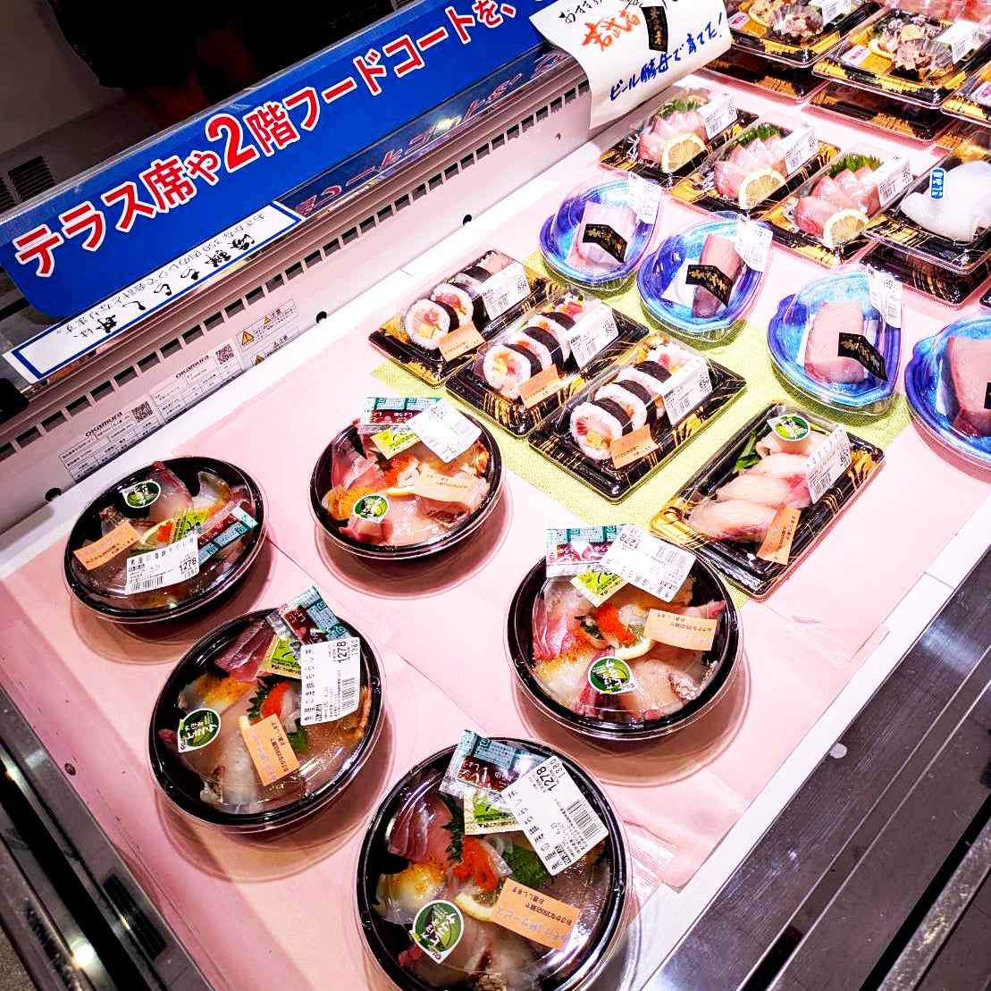 人気商品の海鮮丼と海鮮巻きは2階飲食スペースでお召し上がりいただけます。ネタはその日に入った新鮮な魚介類を使用しておりますので、その日によって内容が変わります。また、その日のうちでもネタが違う丼がございます。ネタをよくご覧になって、お好きな丼をお選びください。また、うれしい味噌汁付き(海鮮巻きにも付きます)!蓋付きの容器でお渡ししますので、お持ち帰りの際の心配はご無用です。