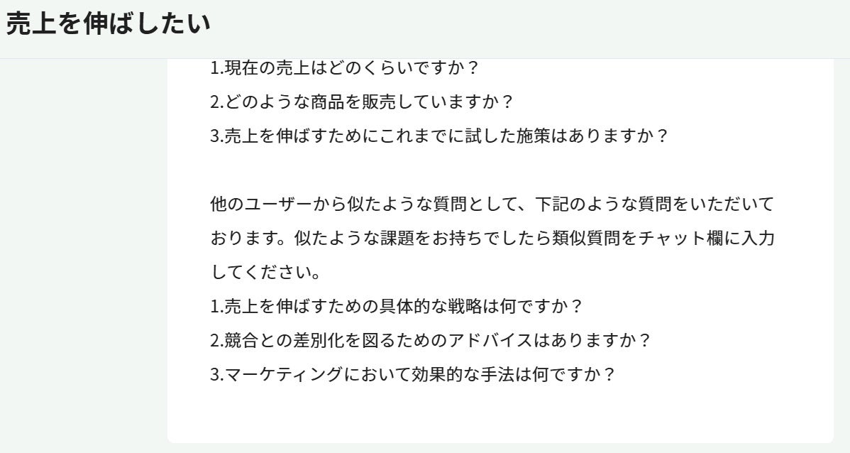経営アシストチャットは、「情報が足りず、課題への対案が漠然としているなか、いきなり専門家に連絡を取るのは難しい」との声にお応えしたものです。
