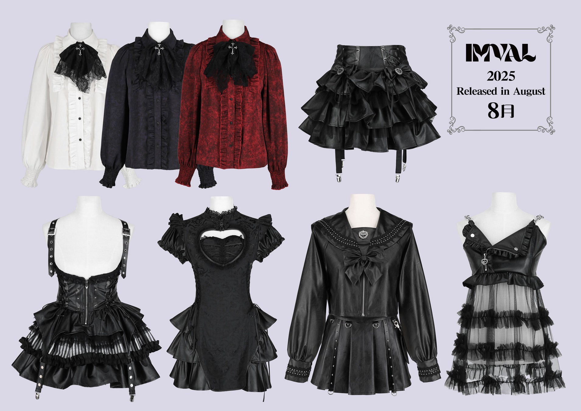 8月の新作は、クラシカルなフリルブラウスから、セーラー・チャイナといった構築的ワンピースまで“可憐さの中に刃を忍ばせる”IMVALの哲学をさらに尖らせたラインナップ。