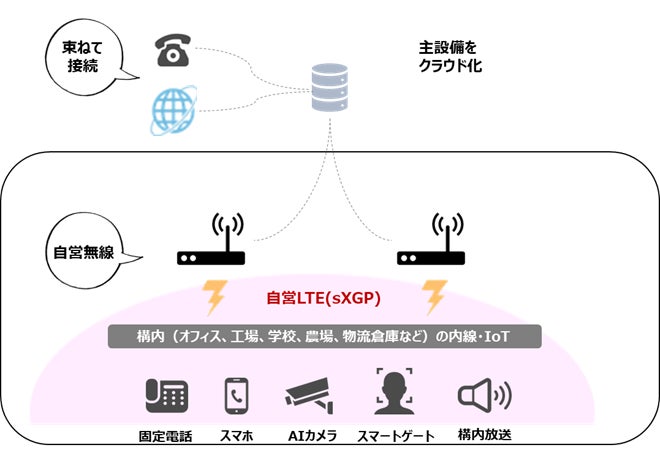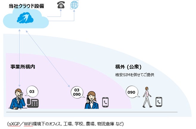 お客様はインフラ主設備を所有せずに、プライベートネットワークであるsXGP網をかんたんに構築可能になります。その環境下、お客様(またはお客様の代理人)の専有無線APとスマートフォンと組み合わせることで、電話などの構内通信のアップグレードが圧倒的な低コストで実装できるようになりました。