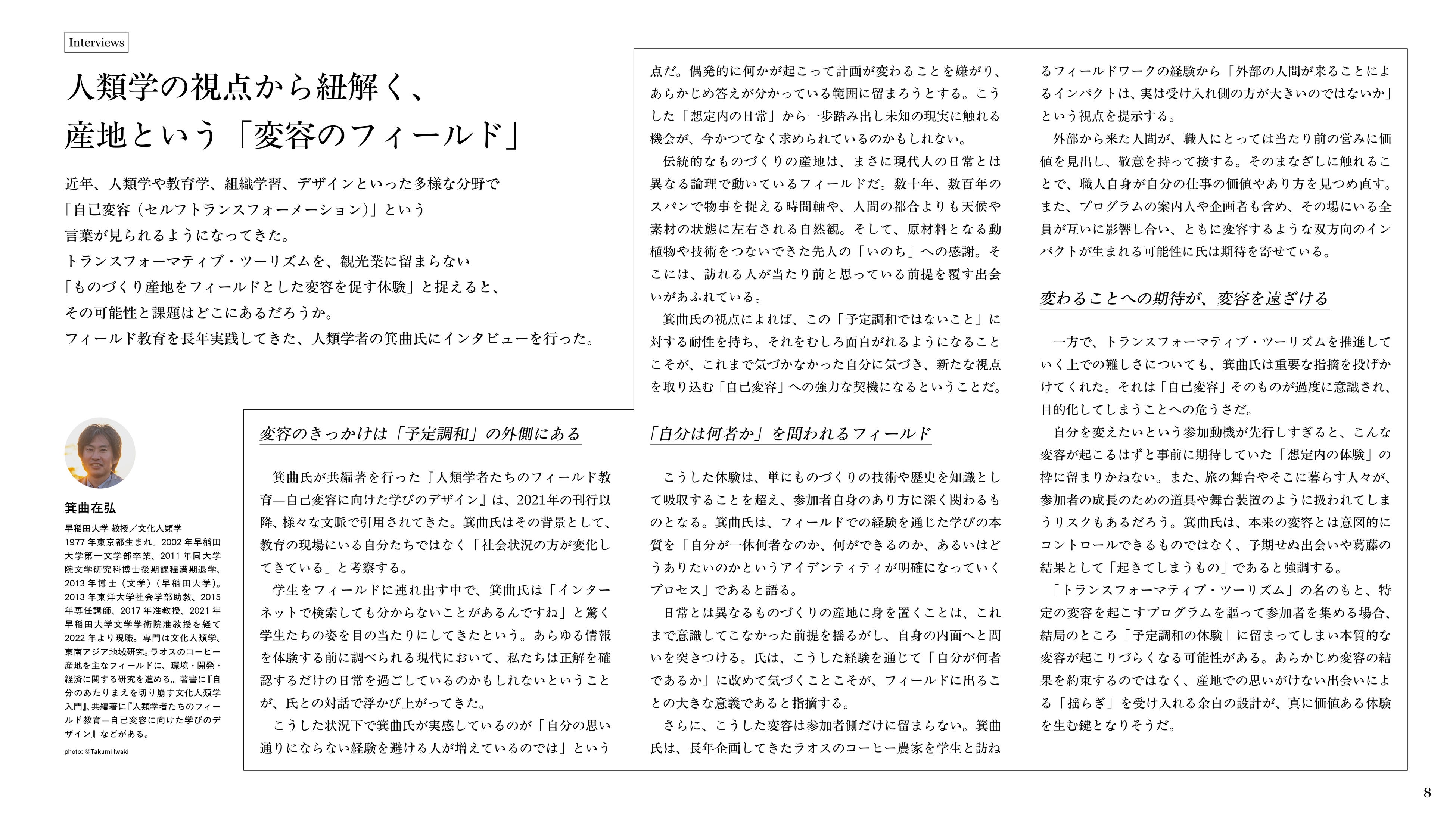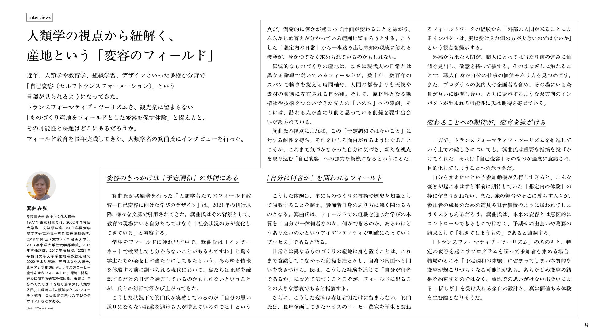 文化人類学者の箕曲在弘氏(早稲田大学教授)へのインタビューを通じ、予定調和ではない産地での経験が、参加者自身のあり方を問い直す強力な契機になることを解説しています。