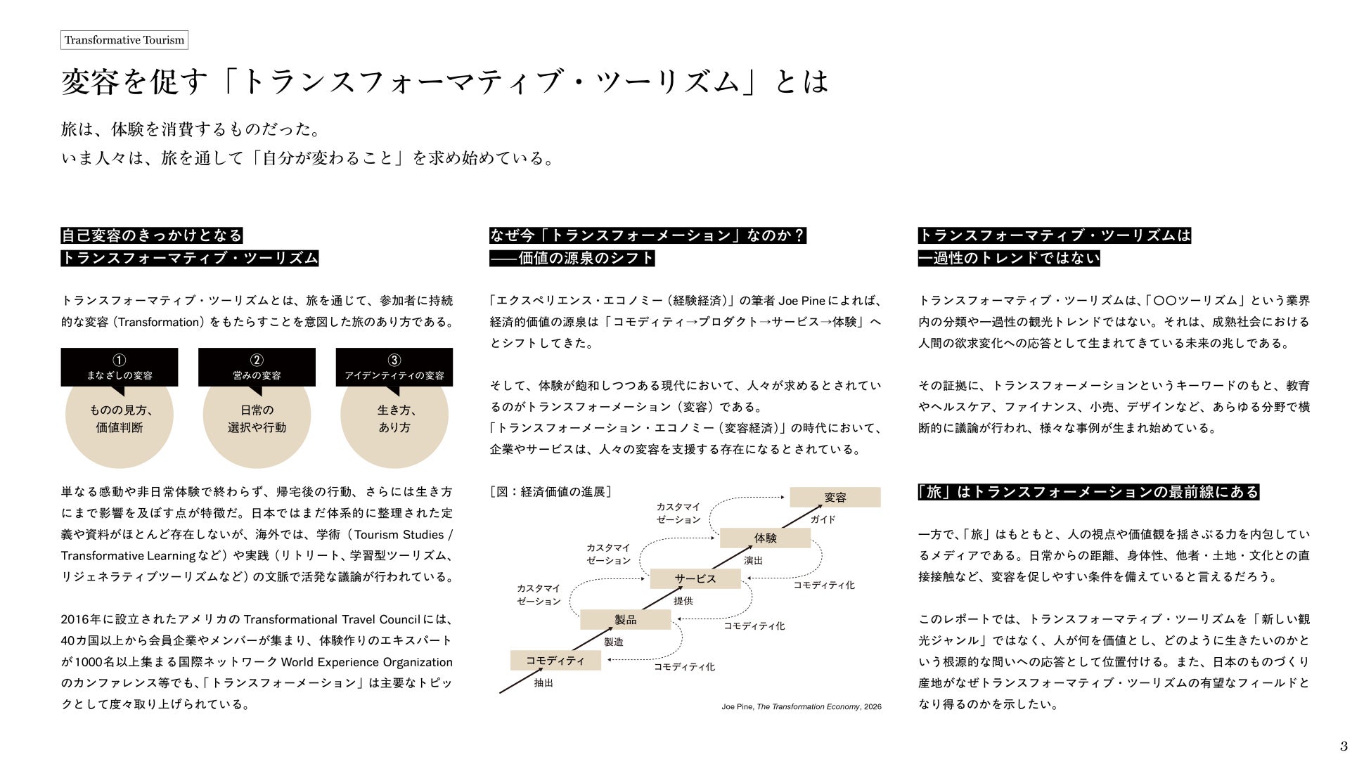 レポートでは、トランスフォーマティブ・ツーリズムを「新しい観光ジャンル」ではなく、人が何を価値とし、どのように生きたいのかという根源的な問いへの応答として位置付け、日本のものづくり産地がなぜトランスフォーマティブ・ツーリズムの有望なフィールドとなり得るのかを示しています。