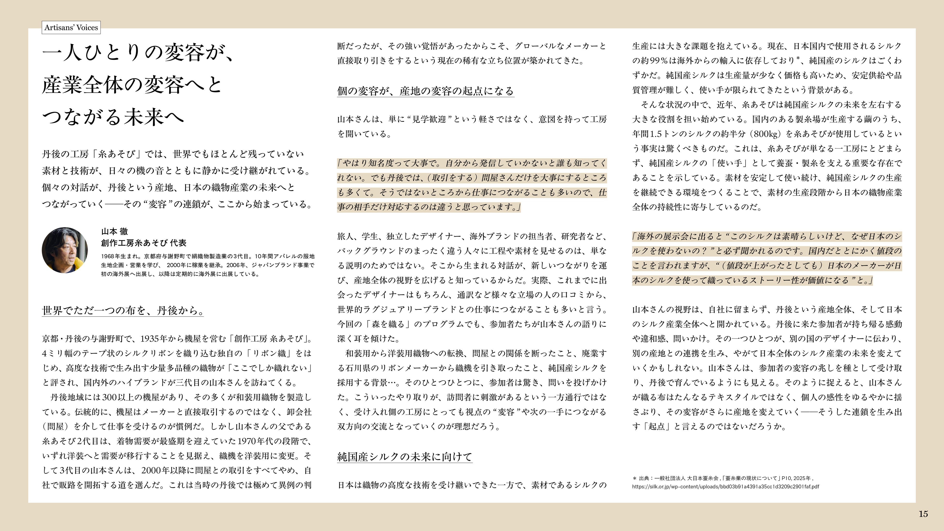また、効率化によってものづくりが地域から切り離された現代において、日本のものづくり産地は、気候や風土、精神性、歴史と重なり合って形成された「生きている遺産」として息づいており、
