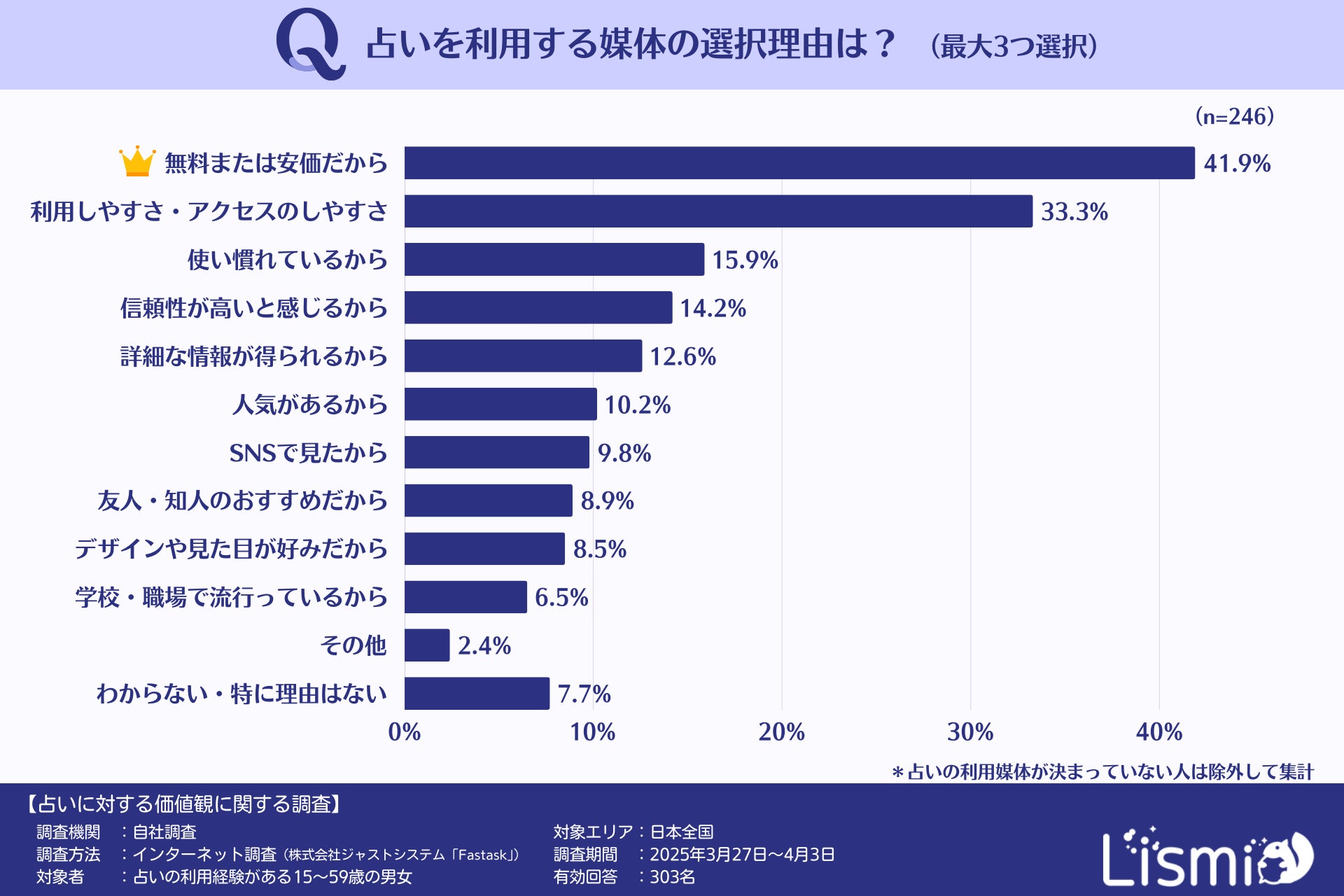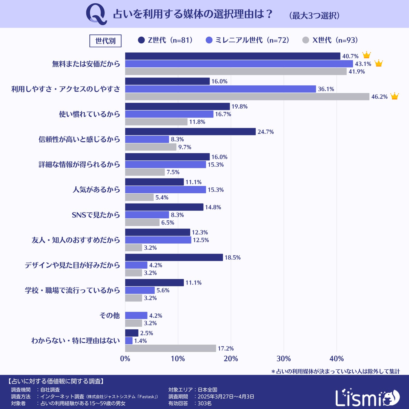 2.占い媒体の選択理由は「無料または安価」が41.9%でトップ、Z世代は「信頼性」も重視するのが特徴