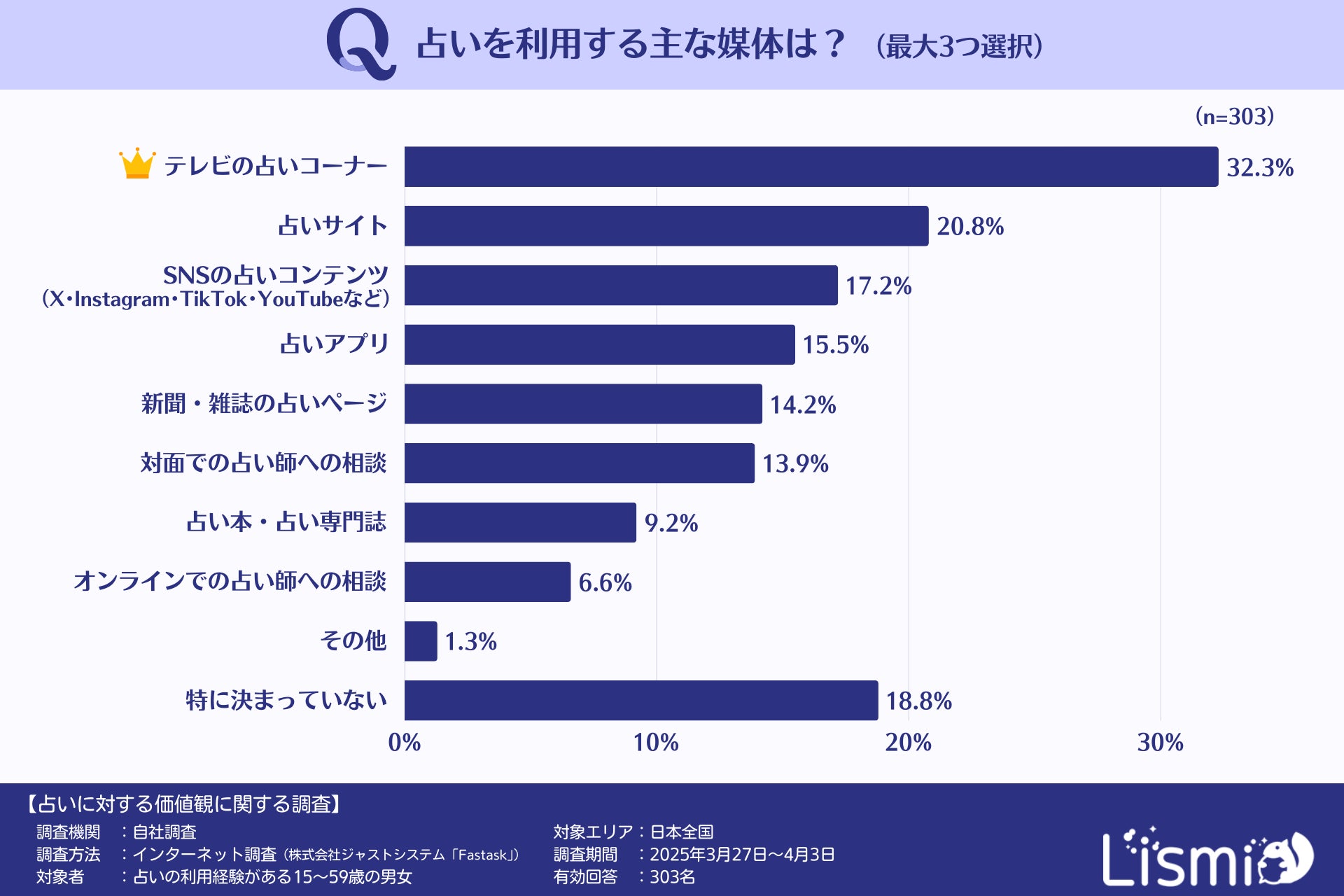 1.利用媒体は「テレビの占いコーナー」が32.3%で最多、Z世代は「サイト・SNS・占い師」など多様な媒体も活用