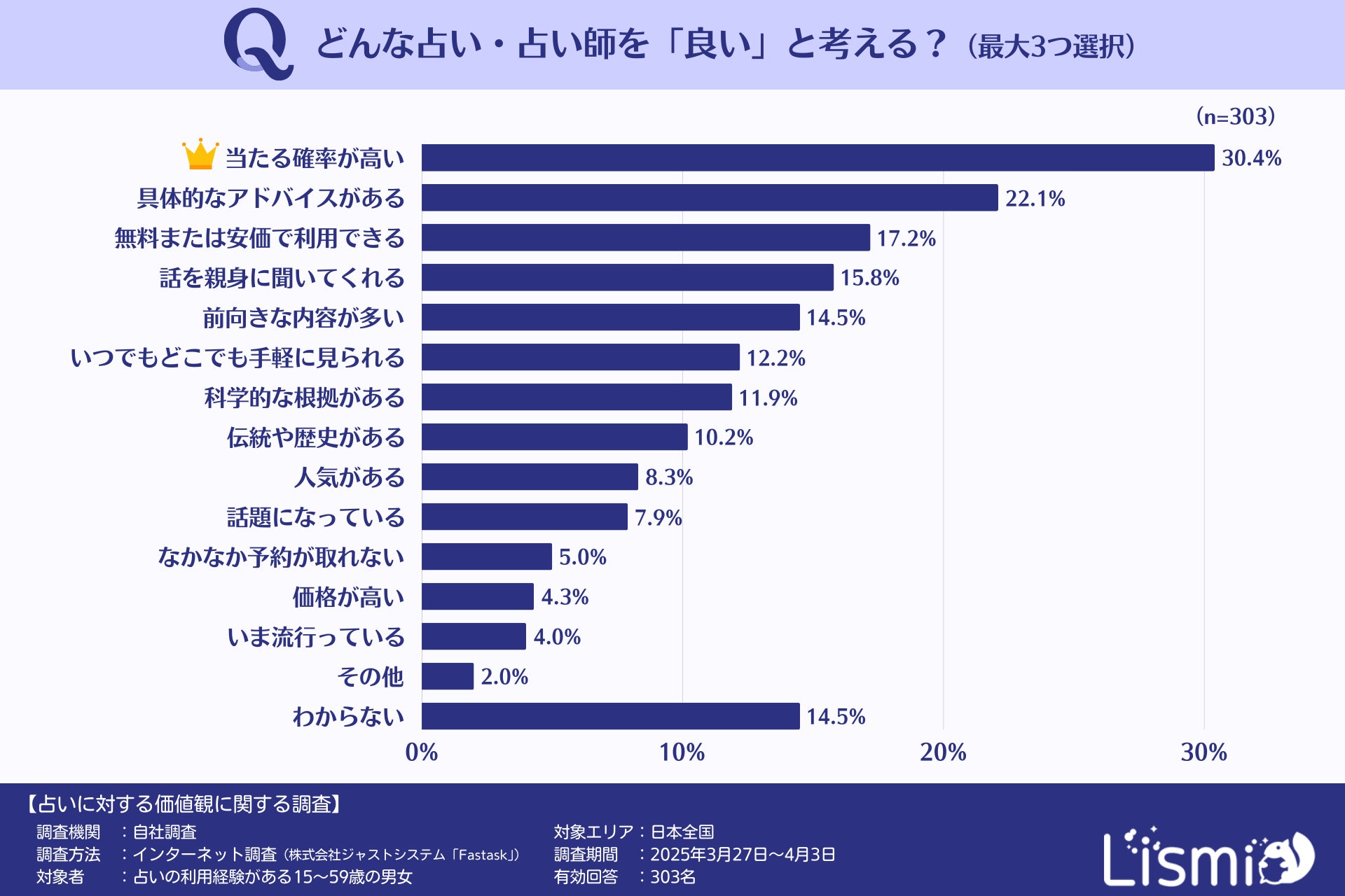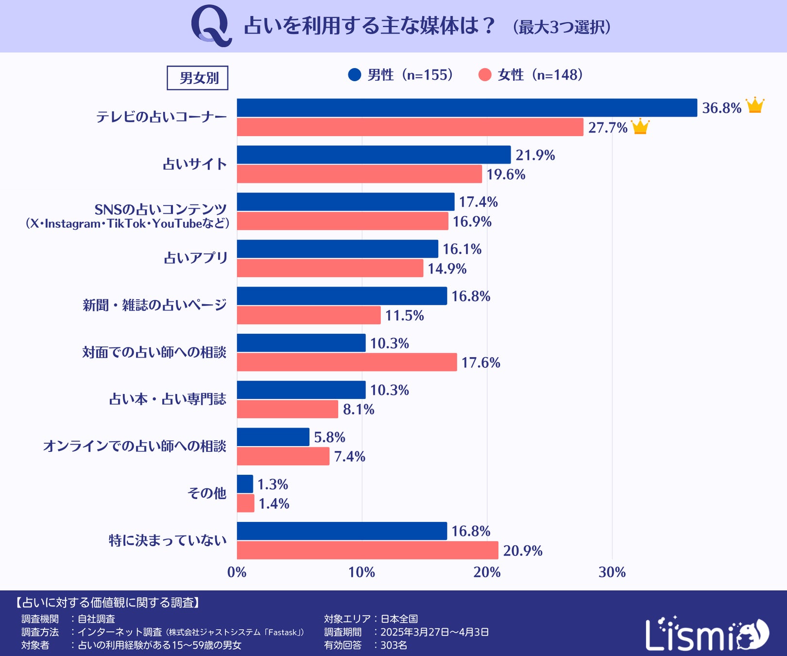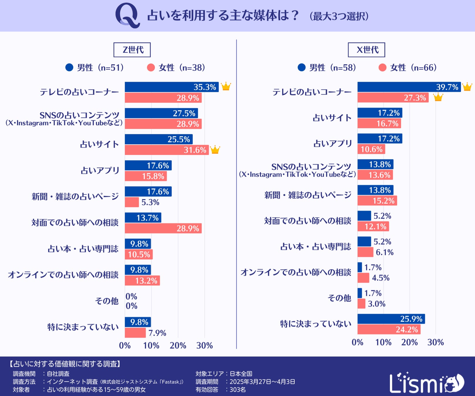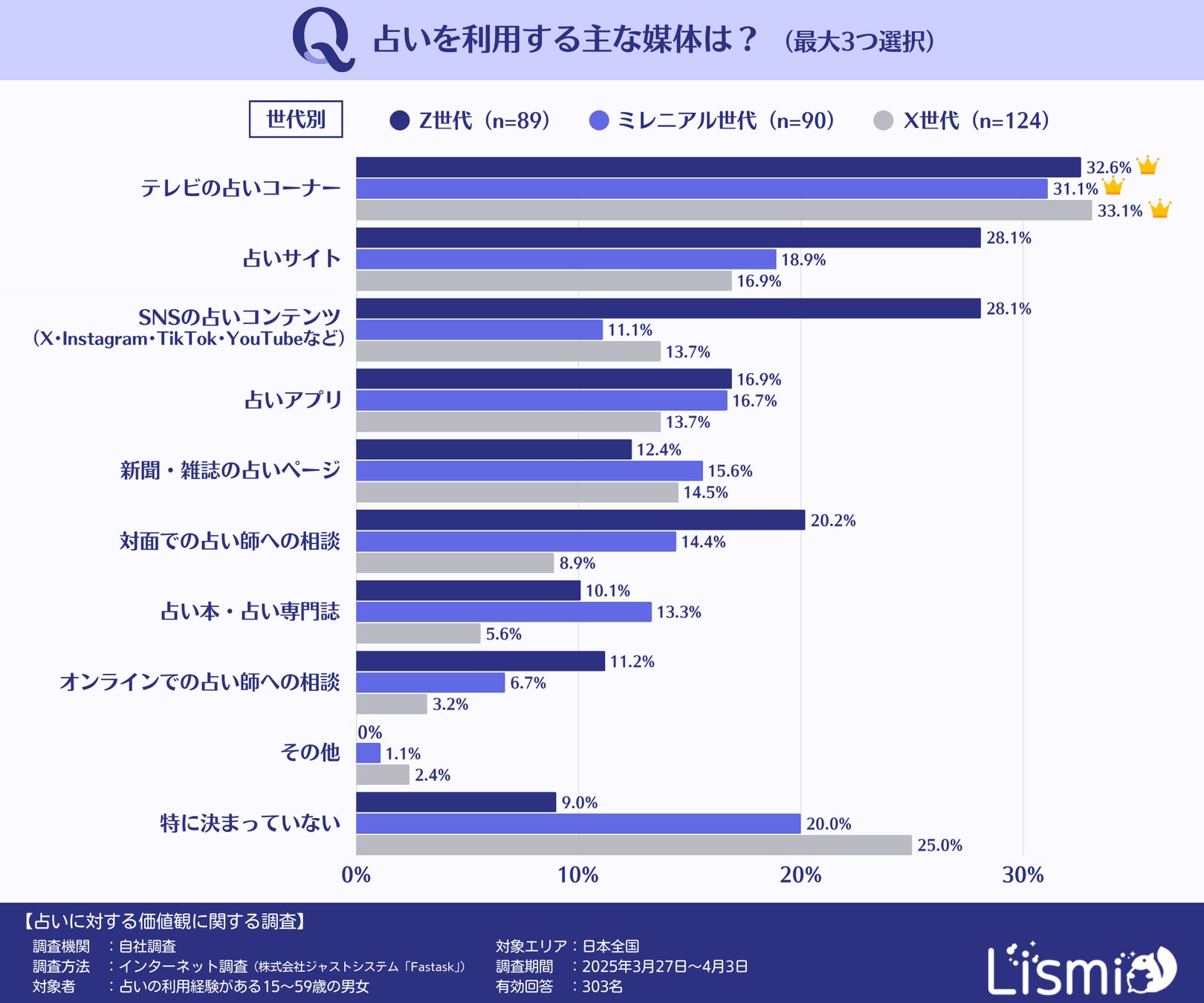 チャット占いアプリを提供する株式会社リスミィ( https://lismi.jp/ )(本社:大阪府大阪市、代表:池内康浩)は、占いの利用方法や占いに対する価値観に関する世代・男女による違いを調査するため、15~59歳の占いの利用経験がある男女303名を対象にアンケートを行いました。本調査からは、Z世代がSNSや対面占いを積極的に活用し、デジタルとリアルの両方を重視する傾向が見えてきました。