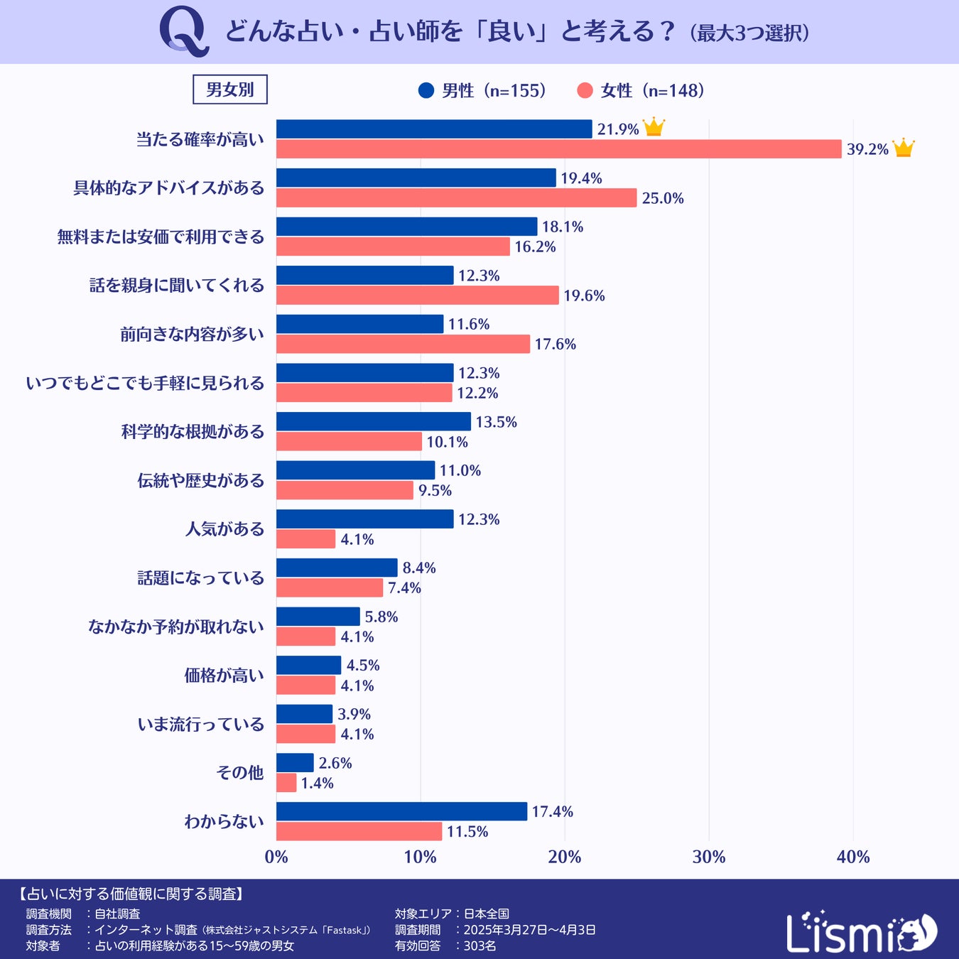 男性で最も多かったのは「当たる確率が高い」の21.9%、次いで「具体的なアドバイスがある」が19.4%、3位は「無料または安価で利用できる」の18.1%でした。一方、女性では「当たる確率が高い」が39.2%と最も多く、次いで「具体的なアドバイスがある」が25.0%、3位は「話を親身に聞いてくれる」の19.6%となっています。