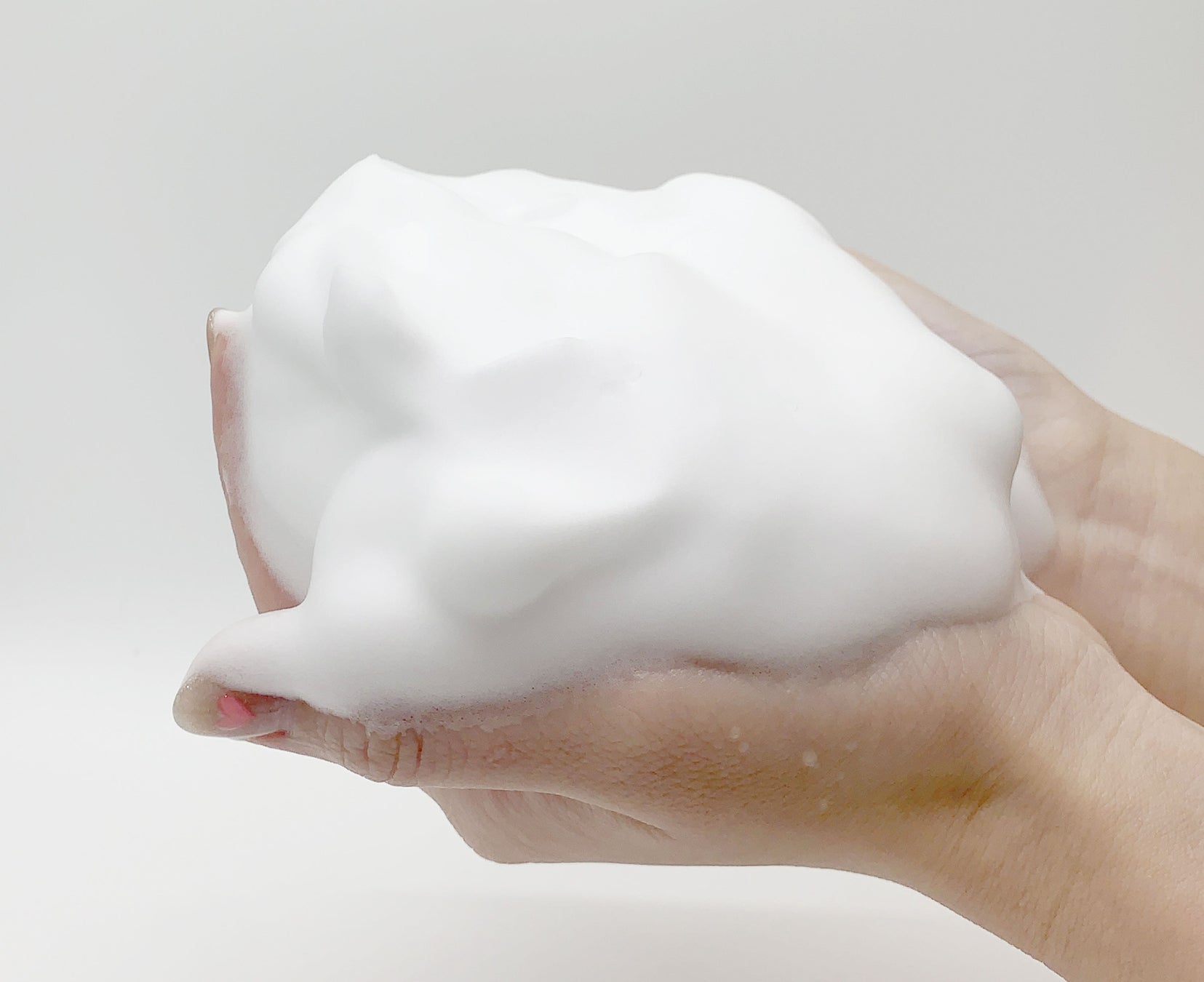 ❶容器をよく振り、下向きの状態で適量の泡を手のひらに出してください。