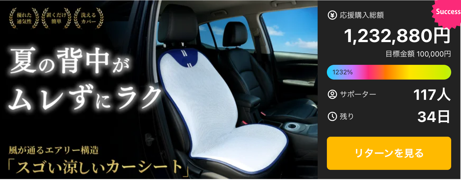 2025年の記録的猛暑を経験した日本に向けて、“背中のムレ”と“暑さ”を同時に解消する、夏必須のカーシートとして、プロジェクト開始からわずか1日で116万円以上の支援を獲得するなど、夏の“即戦力アイテム”として大きな反響を呼んでいます。