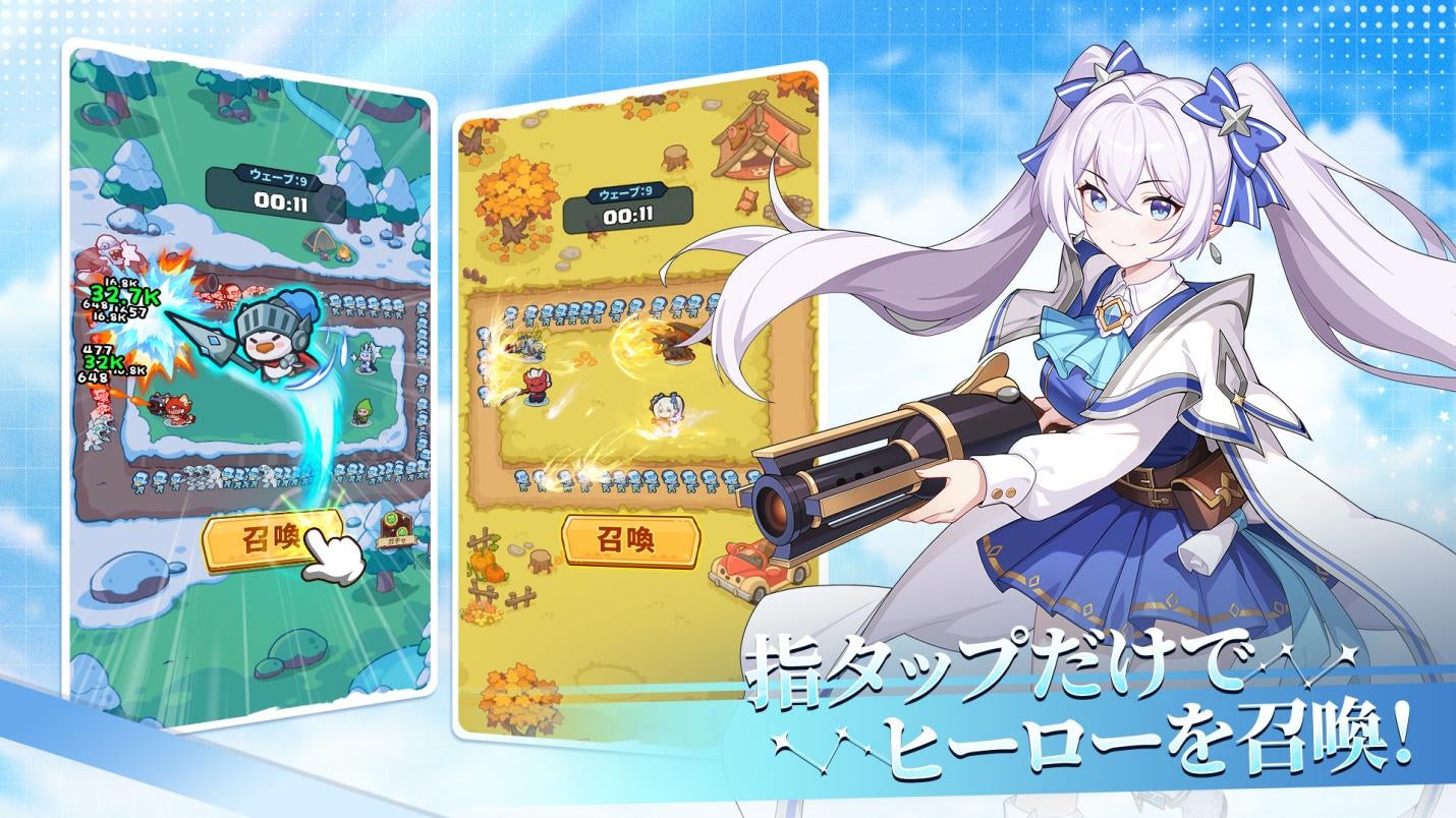 本作は、ローグライク要素を融合させたタワーディフェンスRPGです。氷原を舞台に、迫りくるゾンビの大群をタップ操作で撃退。ヒーローを次々に召喚・配置し、同じヒーローを合成して、より強力な「神話級ヒーロー」へと進化させることができます。