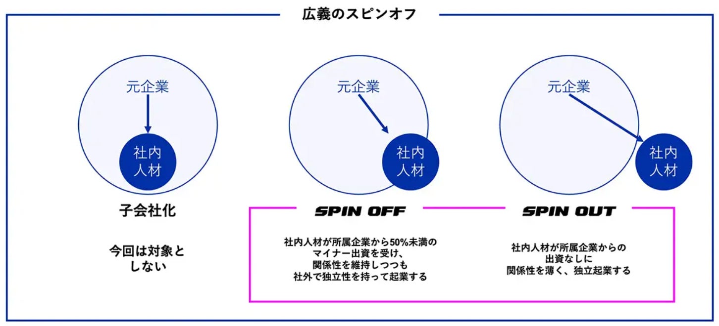 ※スピンオフ・スピンアウトとは: 本プログラムでは、スピンオフ(SPINOFF)は社内人材が所属企業から50%未満のマイナー出資を受け起業、スピンアウト(SPINOUT)は社内人材が所属企業からの出資なしに独立起業していることとしております。