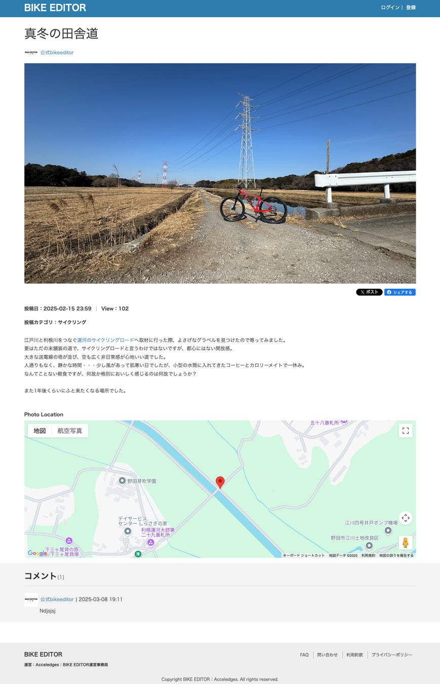 「BIKE EDITOR」は、自転車で出かけた時の思い出を、写真と文章、位置情報も付けて投稿・共有できるライトな参加型SNSです。