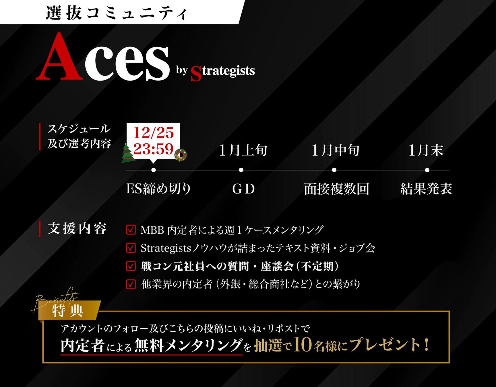 コンサル選考入社支援スクールおよび転職エージェント事業を提供する「Strategists」(運営会社:株式会社トップティア)は、主に戦略コンサルなどトップティア企業を志望する就活生を対象とした選抜型コミュニティ「Aces(エーシーズ)」を開設し、本日より第1期メンバーの募集を開始いたします。