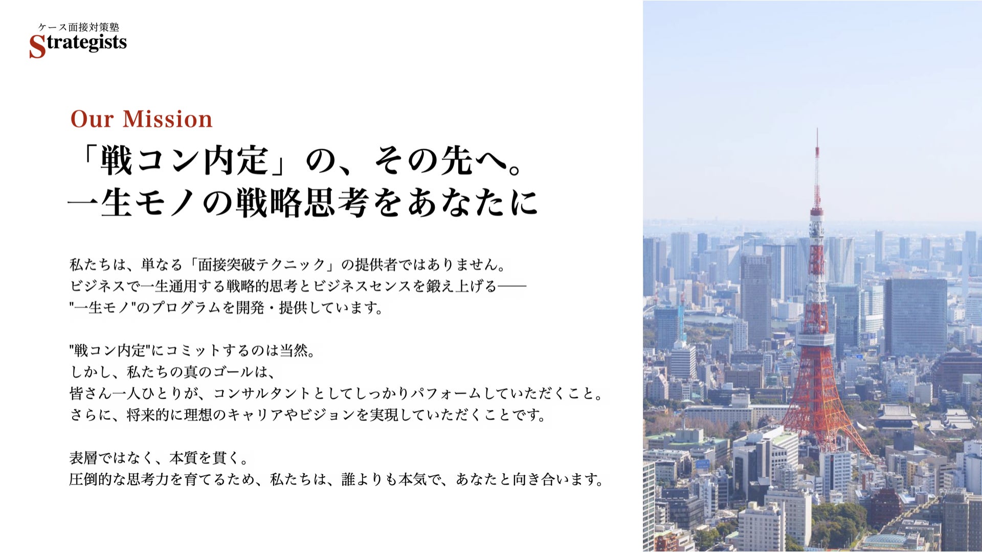 新卒・中途問わず、MBBをはじめとする難関コンサルティングファームへの入社・転職を目指す方に向けた、戦略的思考力養成クール「ケース面接対策塾Strategists」および転職エージェント「Strategists」を運営しています。