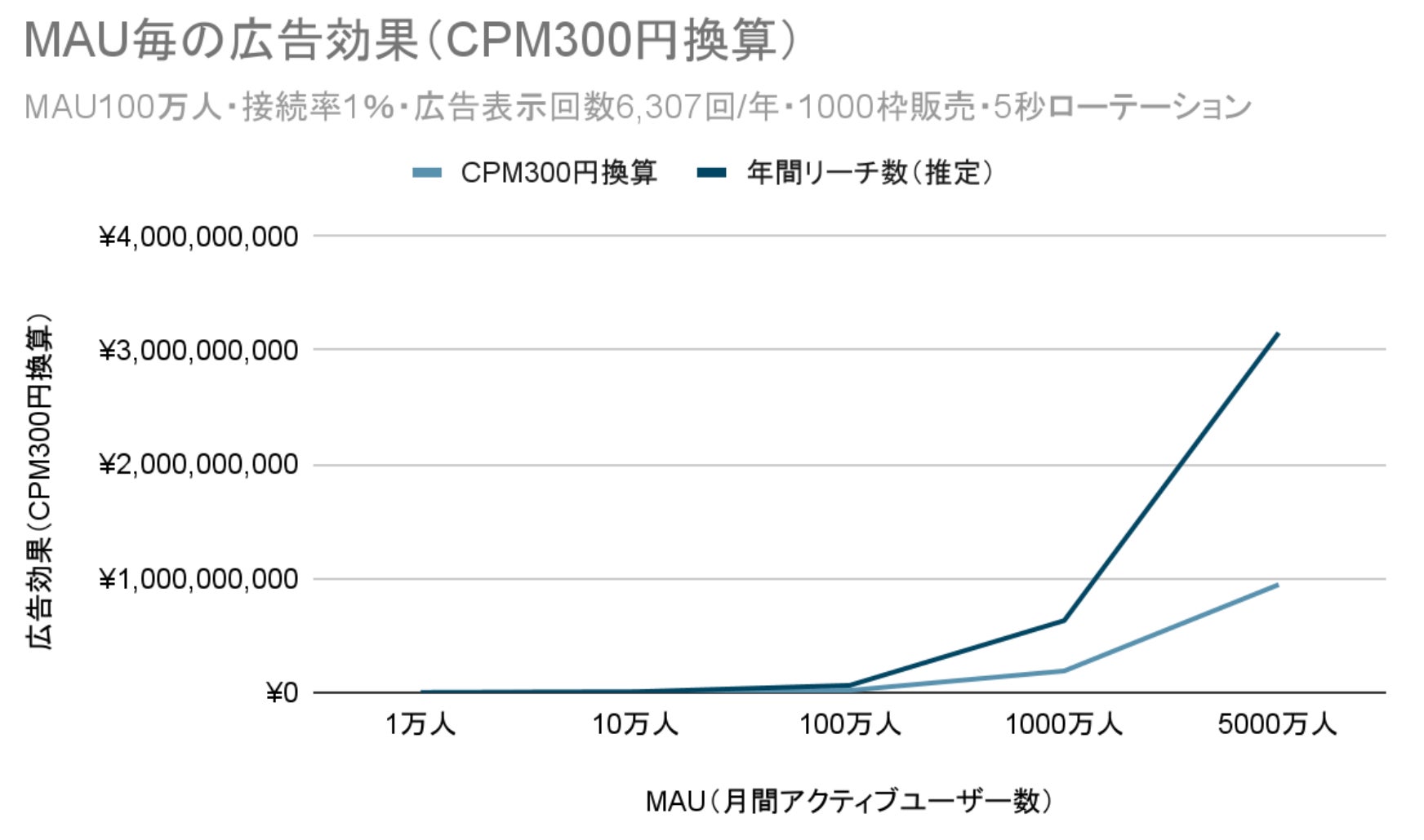 たとえば、MAU100万人・接続率1%の前提であれば