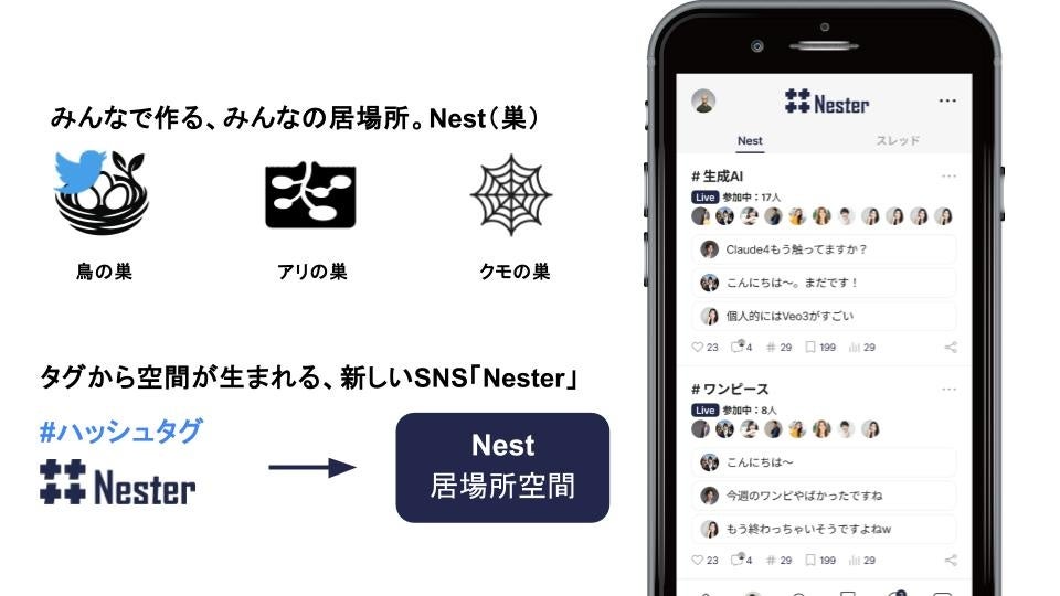 Nester株式会社(本社:東京都中央区、代表取締役:丸山 耀平/以下Nester)は、同社が開発するハッシュタグの先にリアルタイムの交流空間を創る次世代SNS「Nester」において、一般公開時から1年間掲載される広告枠の事前販売を2025年6月3日より開始したことをお知らせします。