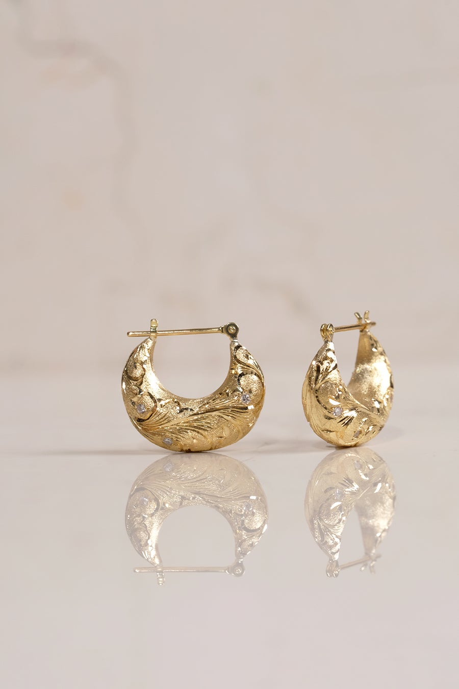 SIXTH NIGHTで好評をいただいている和彫りのシリーズにイエローゴールドのバリエーションが加わりました。柔らかで優しい雰囲気を漂わせるイエローゴールドは、植物紋様と組み合わさることで、より優美な印象を与えます。