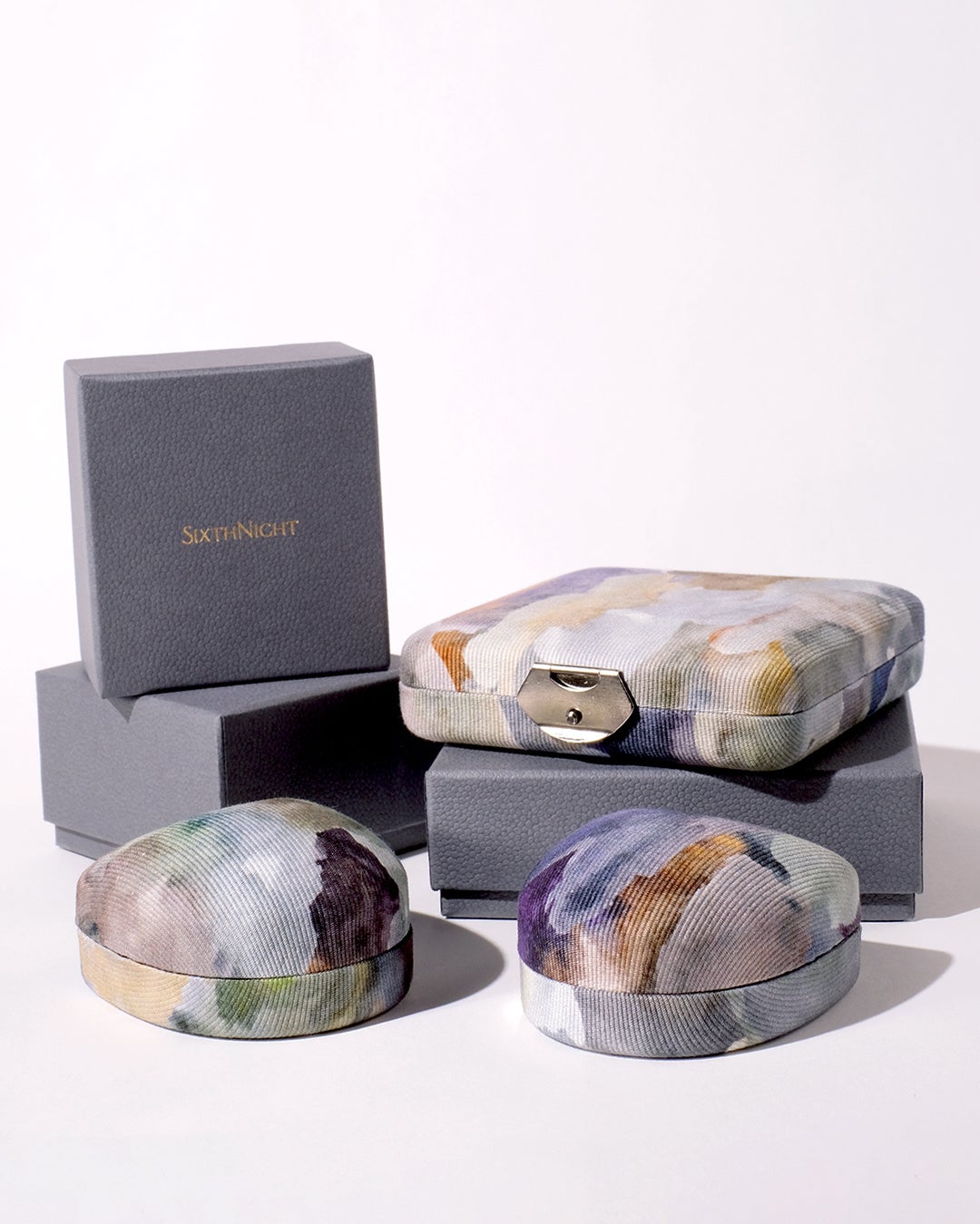 SIXTH NIGHTの新たなジュエリーケースは、日々を重ねていくことの象徴として、刻々と移り変わる空の情景から着想を得て制作されました。淡い紫やピンク、オレンジ、薄い黄色、青など、さまざまな空の色を一枚一枚描き出し、それらをコラージュした天然繊維のオリジナルテキスタイルを作り上げました。空のグラデーションが幾重にもなる美しいデザインのテキスタイルは、どこを切り取っても異なる表情を見せる“空の一片”。まるで空の情景が二度と同じ姿で現れないように、一つ一つのケースに様々な情景が映し出されます。