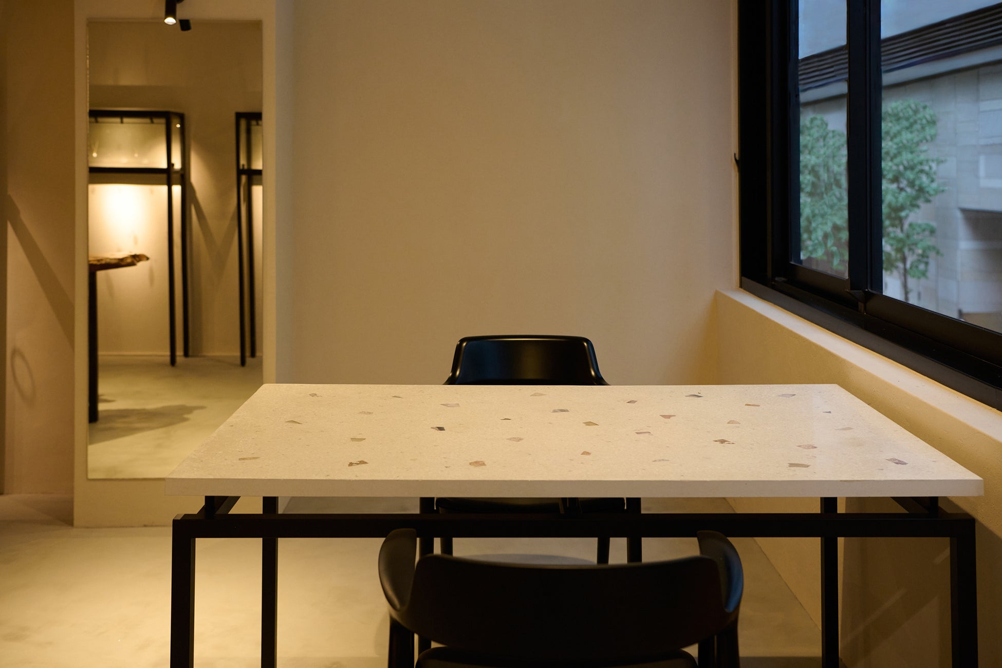 また、応接スペースには、アリゾナや香港などで仕入れの際にデザイナーが集めてきた天然石や真珠などを用いたモザイクテーブルが配置されています。天然石は今回のために甲府の職人により一つ一つカットされたもの。ジュエリーメイキングの川上から川下までのストーリーが集約された遊び心のあるテーブルです。