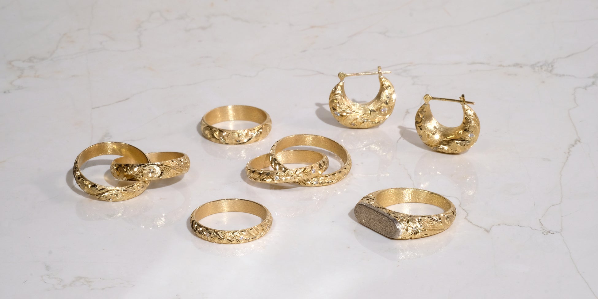 和彫り技術を施した K18イエローゴールド シリーズ |