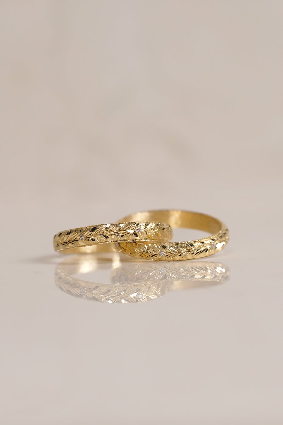 動きのある二連構造のリングに月桂樹の紋様を和彫りで施しました。