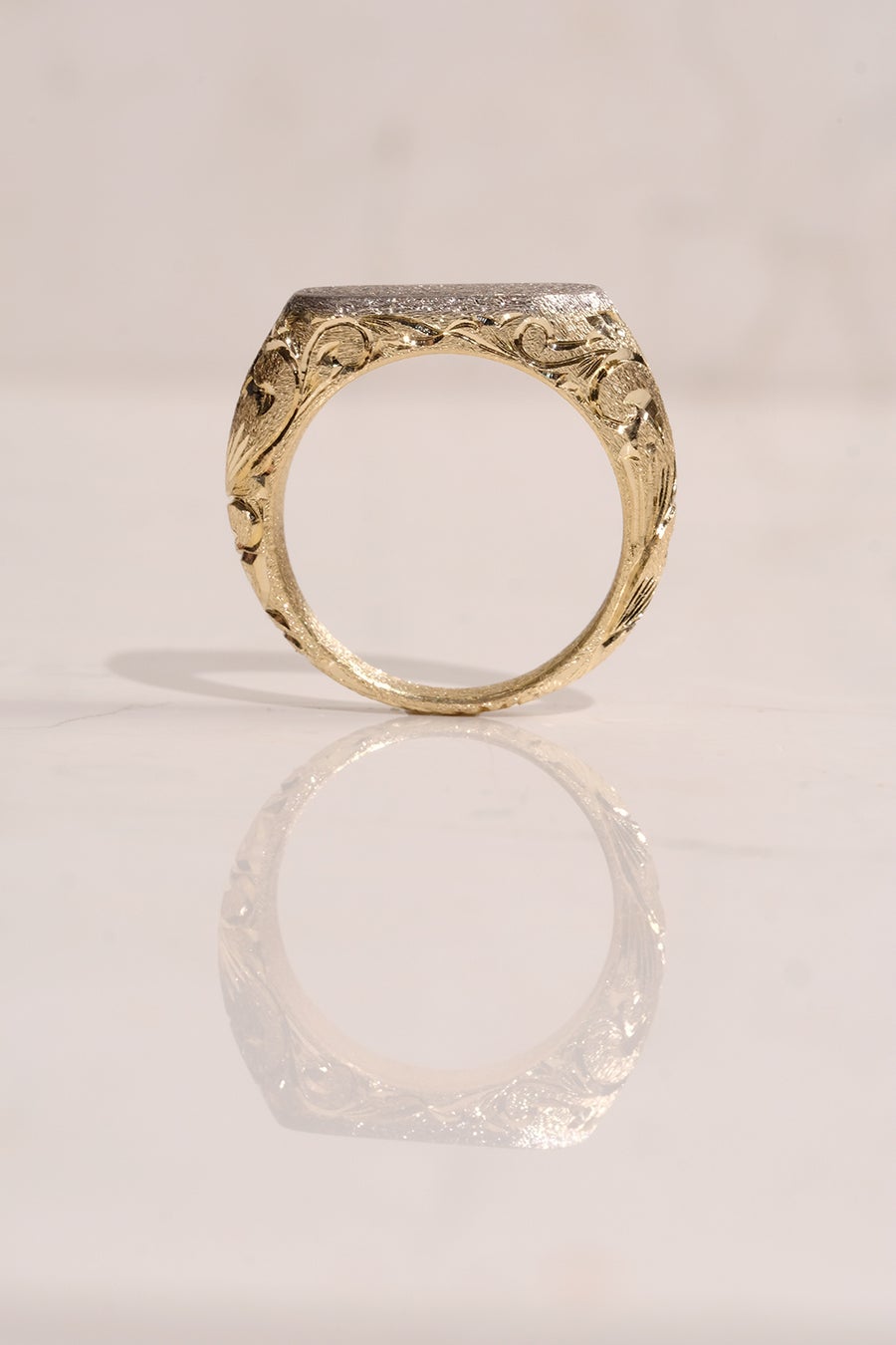 SIXTH NIGHTを象徴するシグネットリング。伝統的な唐草模様を見つめ直し、再構築したアラベスクを施しました。