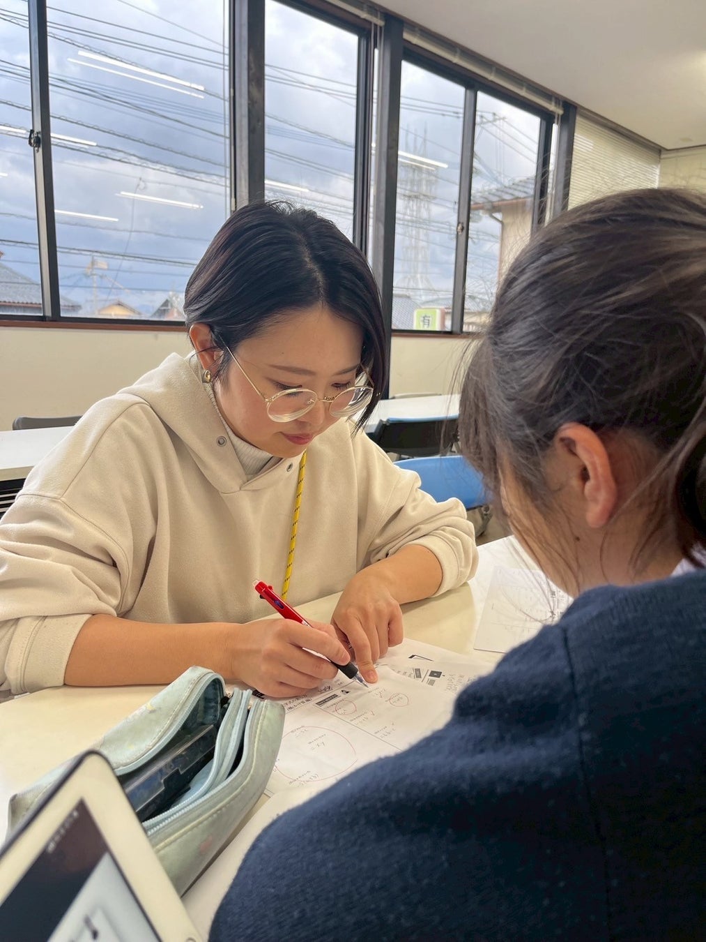 生徒が動画を見終えると、先生は「どこが分かった?」「どこが難しかった?」と優しく問いかけ、理解度を確認。単なる丸付けに終わらず、「なぜ間違えたのか」「どうすれば次は解けるか」を一緒に考えます。