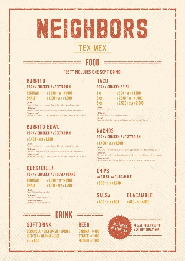 店名:TEX-MEX SHOP「NEIGHBORS」(テックスメックスショップ「ネイバーズ」)