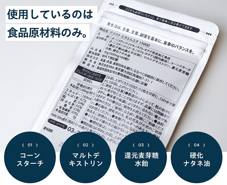 「Taste NMN15000」に含まれている成分は、NMNの他には食品原材料であるコーンスターチ、マルトデキストリン、還元麦芽糖水飴、硬化ナタネ油のみ。
