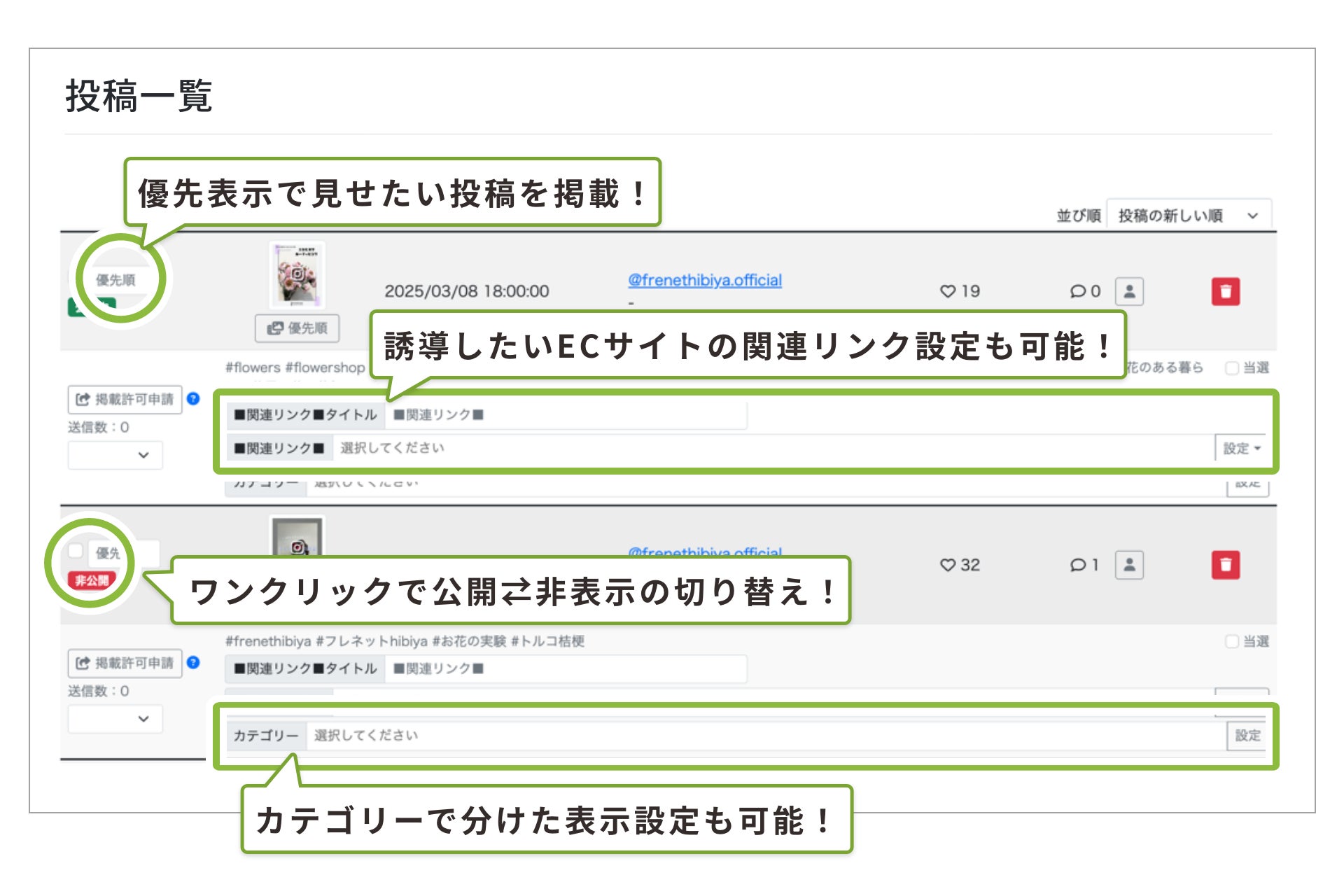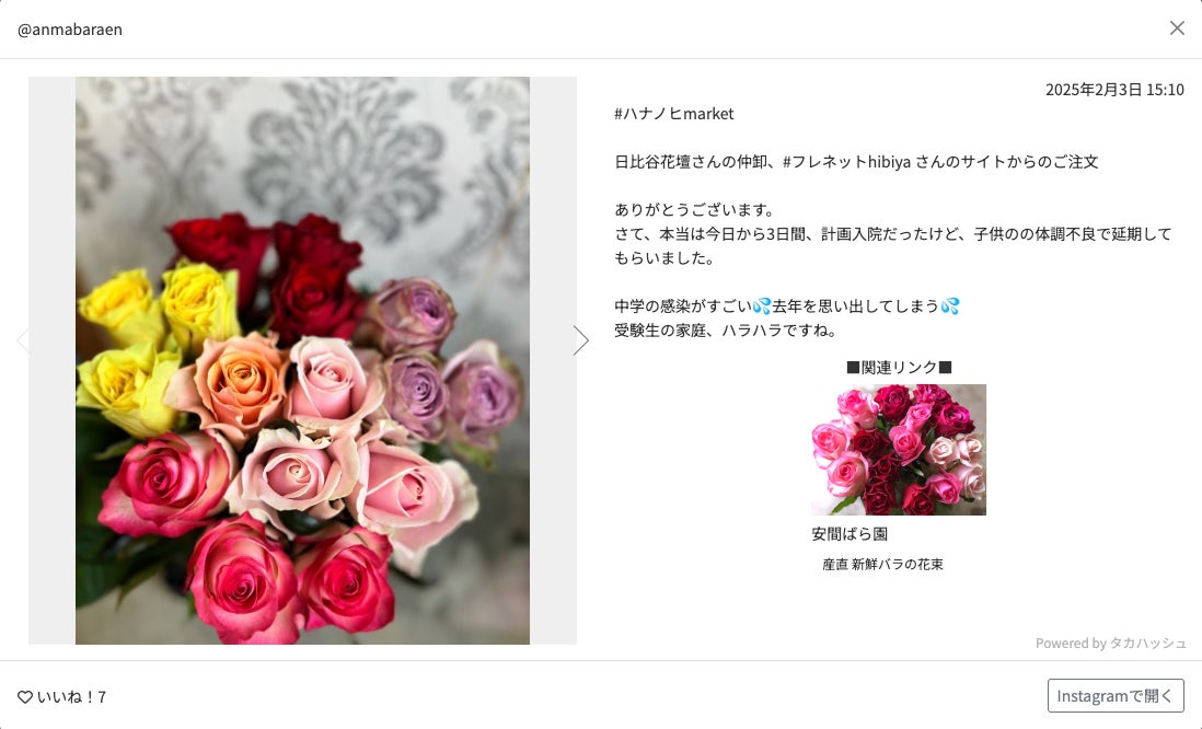 しかし「タカハッシュ」の導入により、Instagramで特定のハッシュタグが付いた投稿を自動で収集し、即座にWebサイトへ表示できる仕組みが実現。投稿は社内の管理画面でチェックしたうえで表示可否を選べるため、品質管理も安心です。