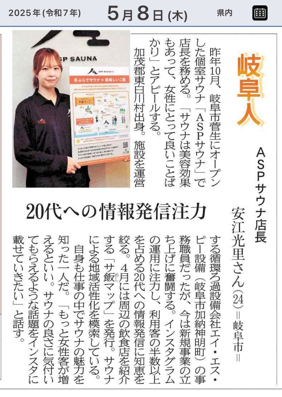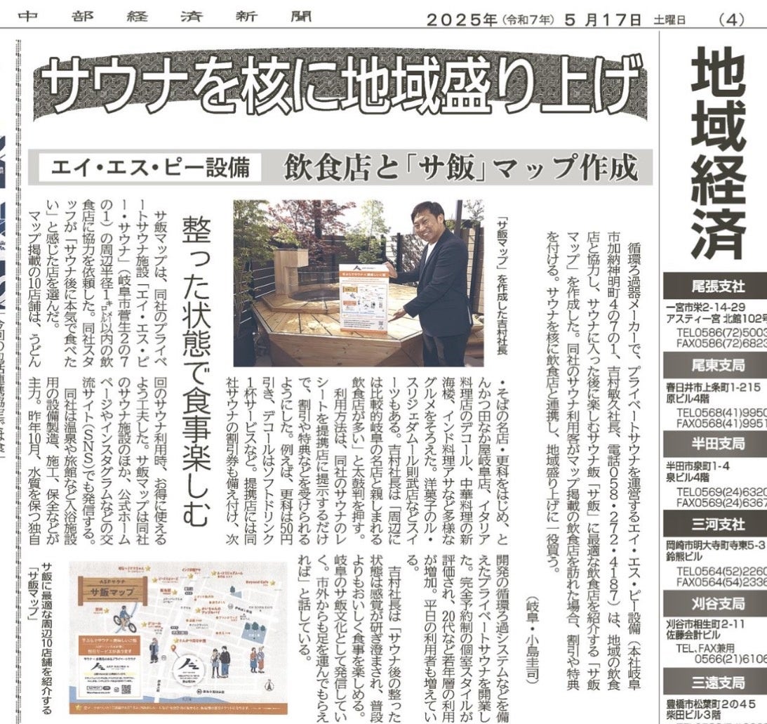 2025年5月8日付の岐阜新聞にて、地域の飲食店と連携し、サウナ後の「ととのい飯」を紹介する「サ飯マップ」の取り組みが、サウナを通じた地域振興の事例として取り上げていただきました。