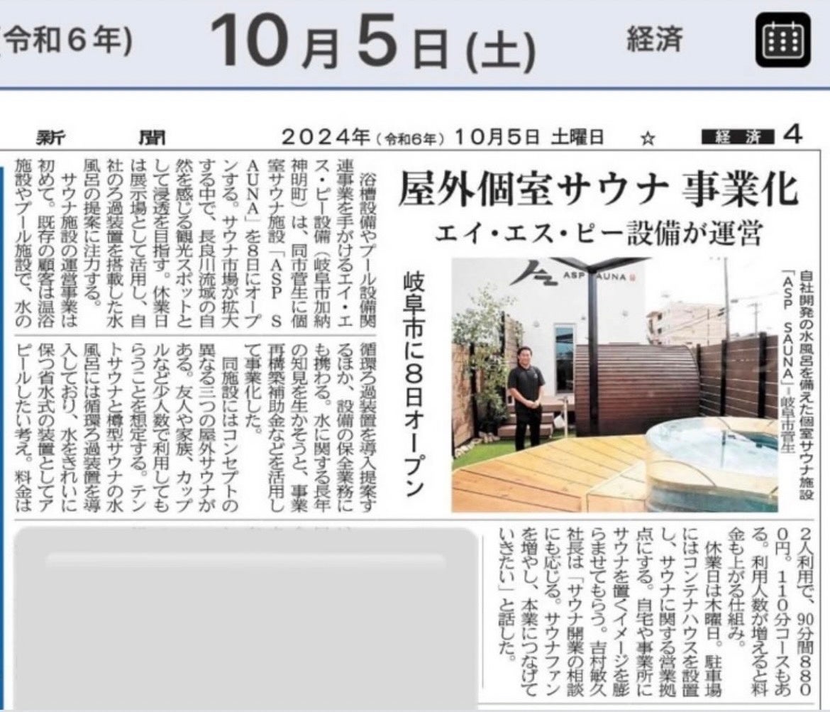 2024年10月5日付の岐阜新聞にて、ASPSAUNAのオープンが地域の新スポットとして取り上げられました。