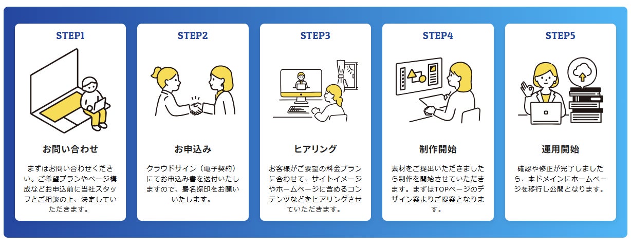 制作開始 – 原稿・写真をご支給後、最短10営業日(シンプル・スタンダードの場合)で公開。