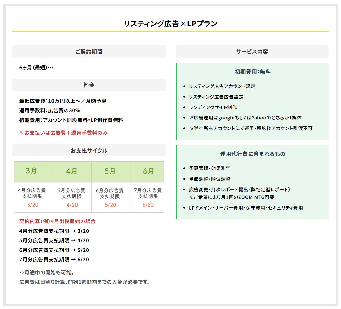 初期費用無料・月額定額で“欲しいときにすぐ持てるWEBサイト”を実現し、事業のスタートダッシュを支援します。またリスティング広告×LPプランでは、LP制作費・月額費が無料に!