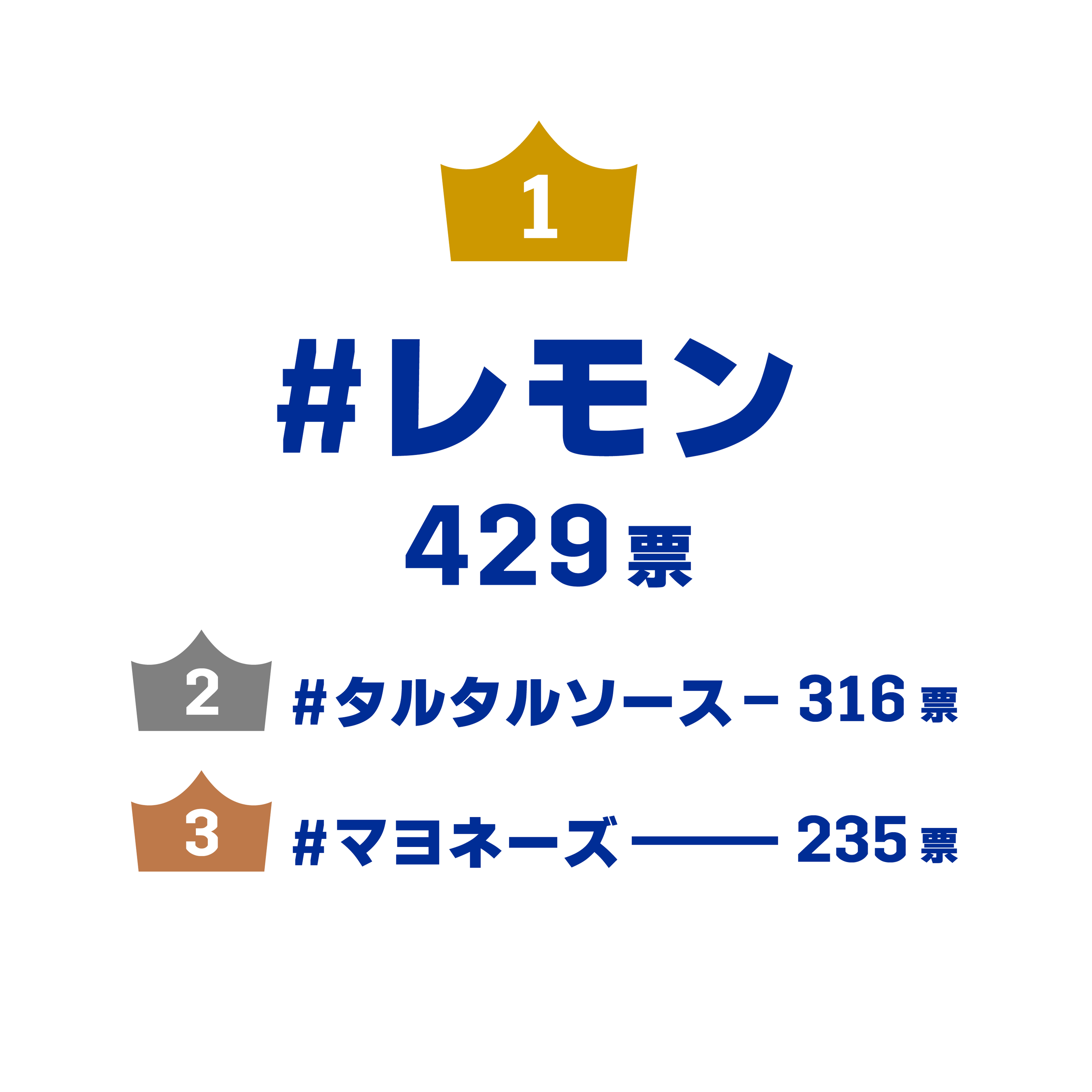 王道のレモンが第1位に輝きました。から揚げの脂っこさを引き締め、後味をすっきりさせる点が支持を集めました。