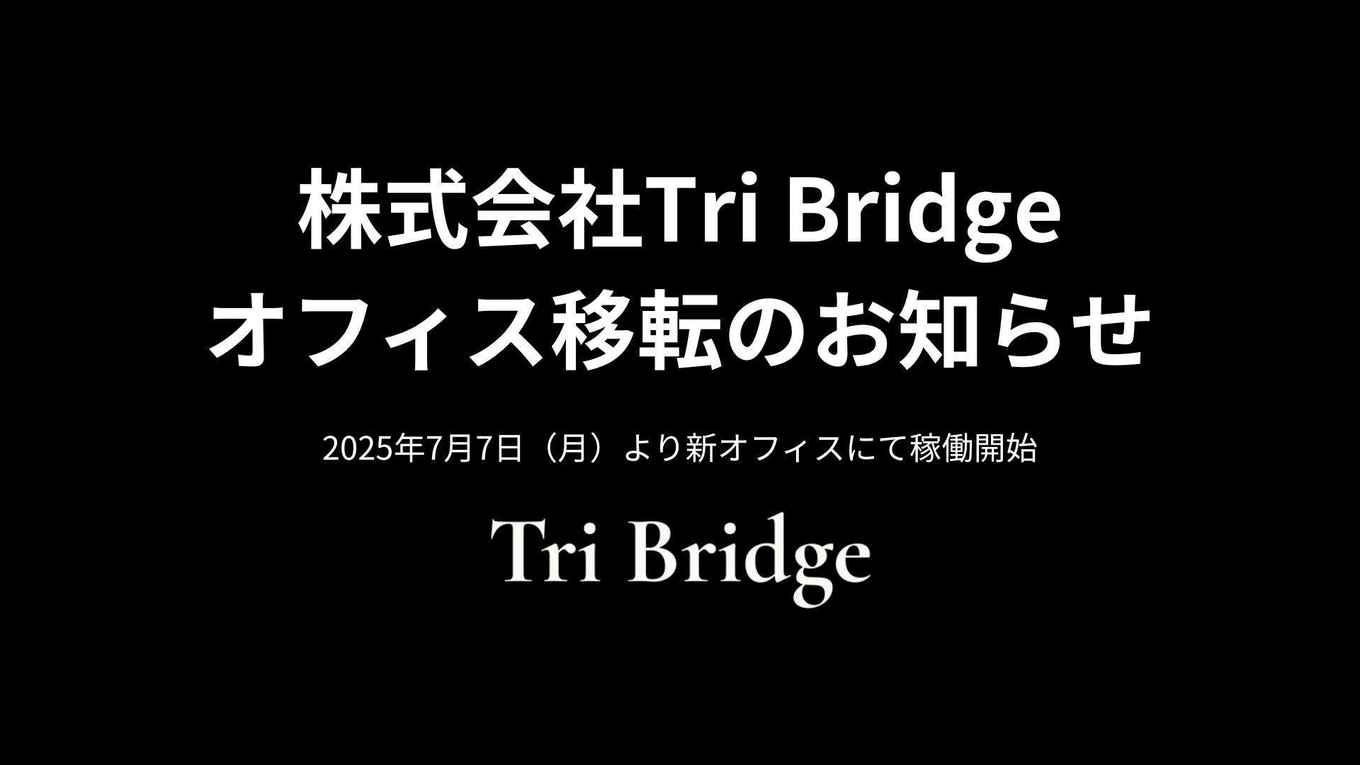 株式会社Tri Bridge(所在地:東京都渋谷区、代表取締役:中野翔太郎、以下「Tri Bridge」)は、メンバーの増加及び今後の更なる事業展開を見据え、2025年7月7日(月)付でオフィスを下記の通り移転いたしましたので、お知らせいたします。